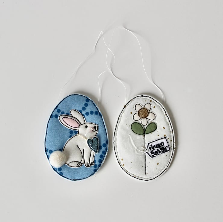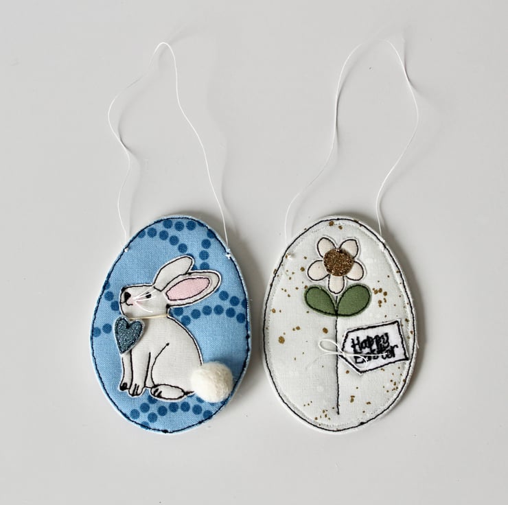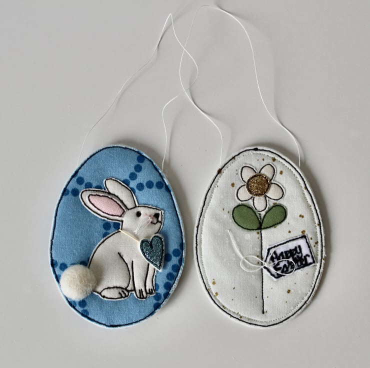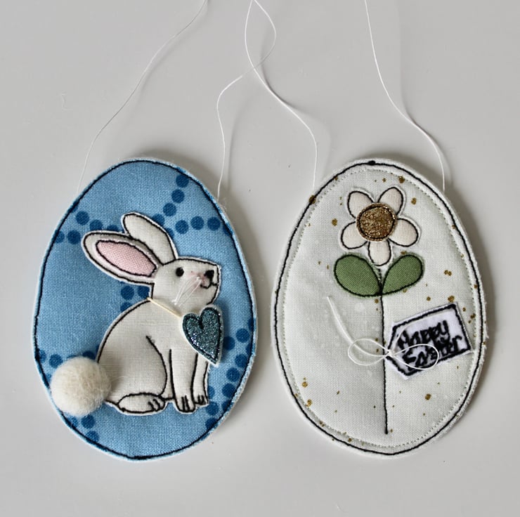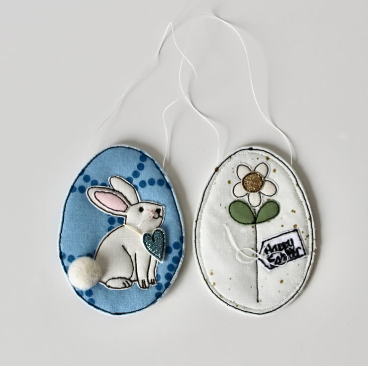 Each egg is sewn using combinations of 100% wool felt, cotton cloth, glitter cloth and free hand machine embroidery; multiple layers of cloth are sewn together and cut out by hand using very sharp scissors. With a linen string to suspend.
