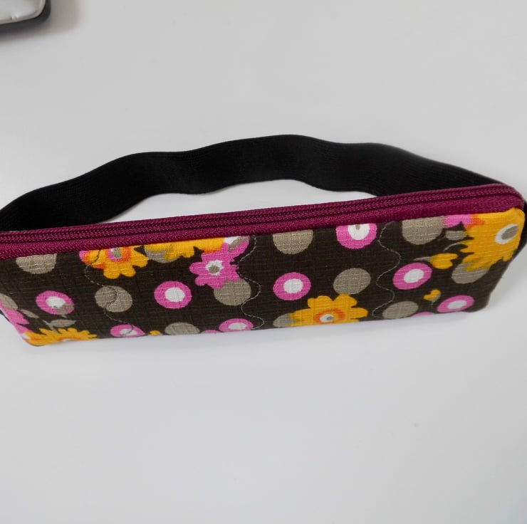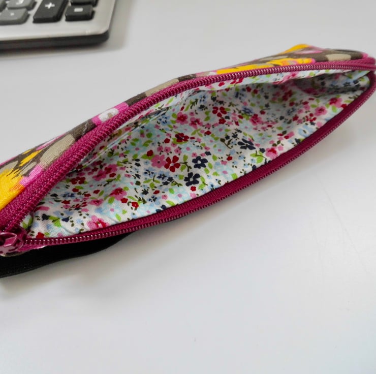 This pencil case has been made from a medium weight fabric which has a very dark brown background with a funky print of yellow flowers and pink spots. I backed this fabric with fusible fleece and then machined three lines of wave stitch on each side to make it slightly quilted. Lined with a ditsy floral printed cotton.