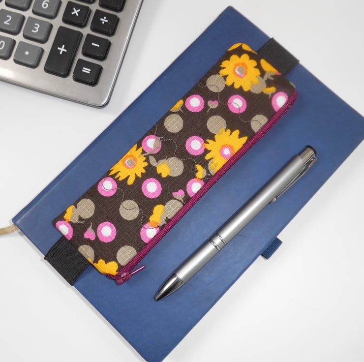 A mini pencil case designed to be kept on the front cover of your diary or journal, held in place with an elastic strap. Just slip it on the front cover and you can always have a pen and pencil to hand. Add it to whichever notebook you are using for the day.