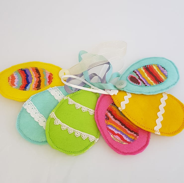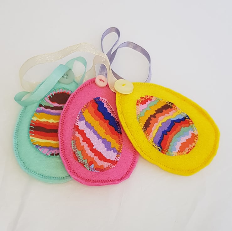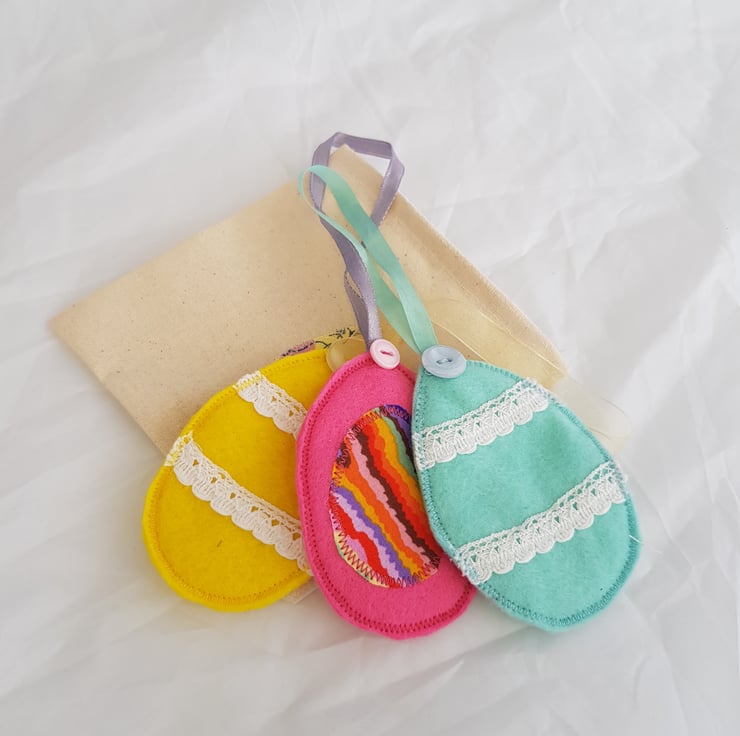 A set of three little felt eggs in bright spring colours to decorate your home at Easter. Each one is unique and a set of three come in a little bag to keep them tidy for another year.