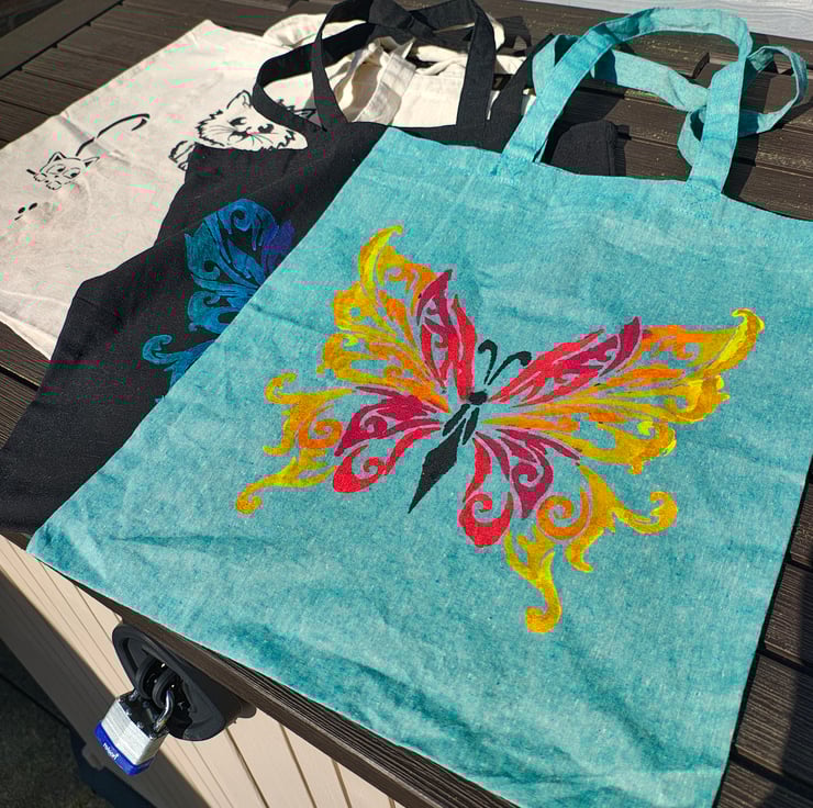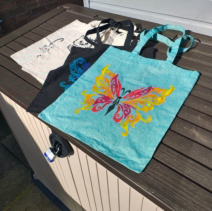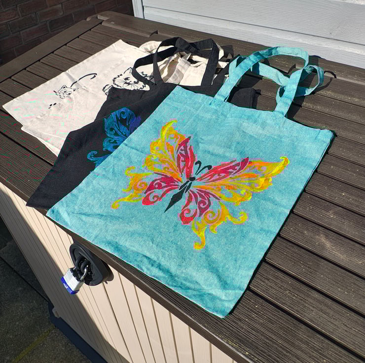 Cotton tote bag with a beautiful hand painted butterfly design on the front, great as a gift bag or just to carry your shopping.