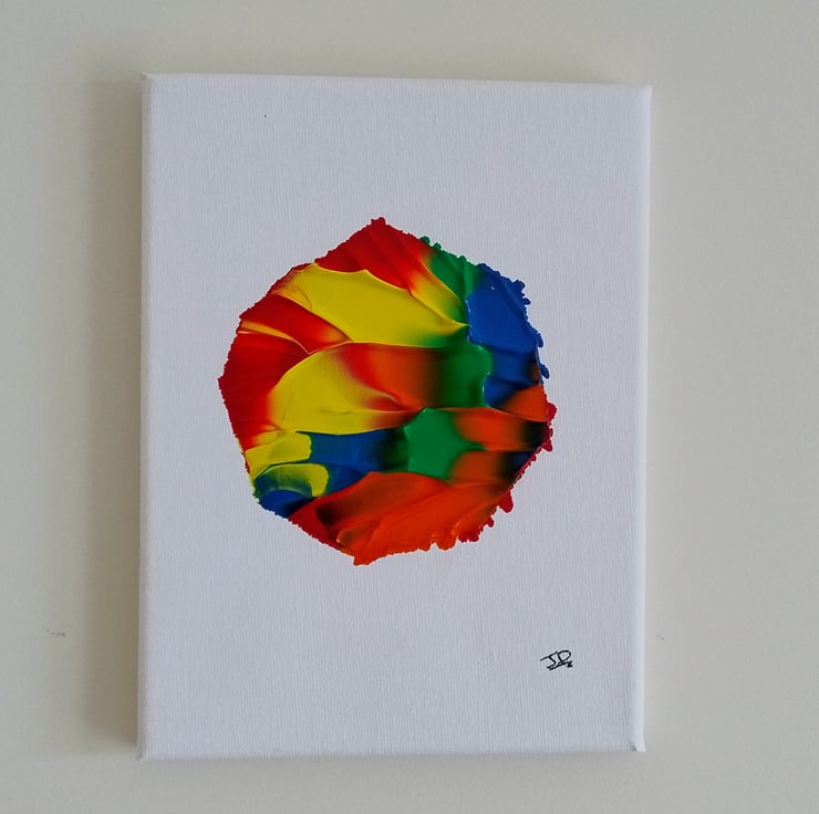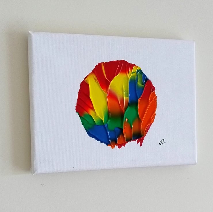 The circular masking keeps the energy contained, like a bright window into a messy, colorful world. One canvas mirrors the other—perfectly imperfect partners for your bookshelf, office, or gallery wall.