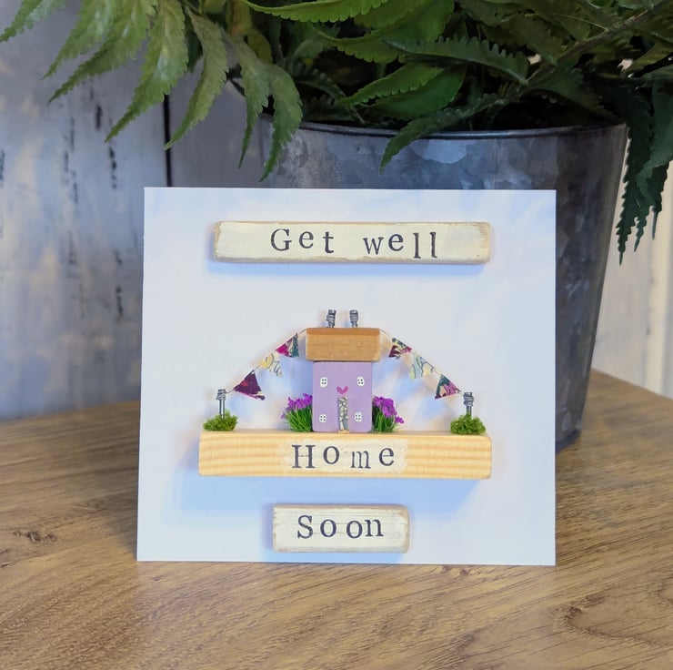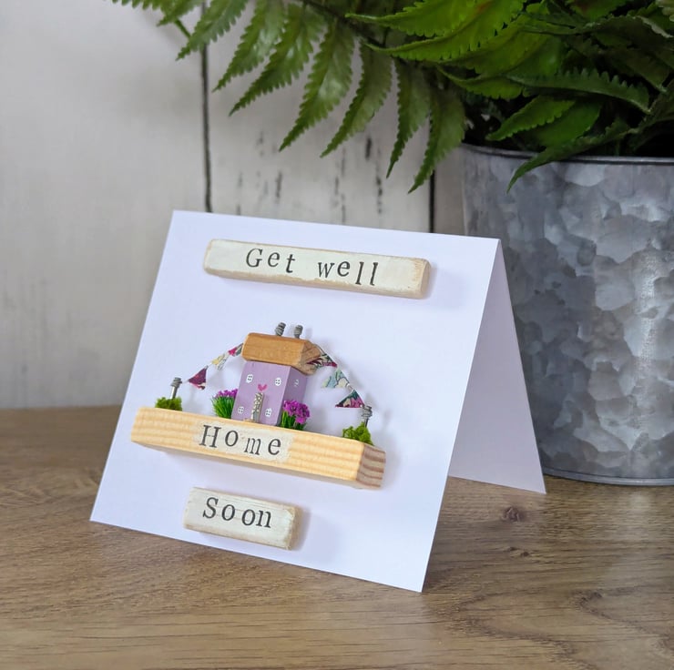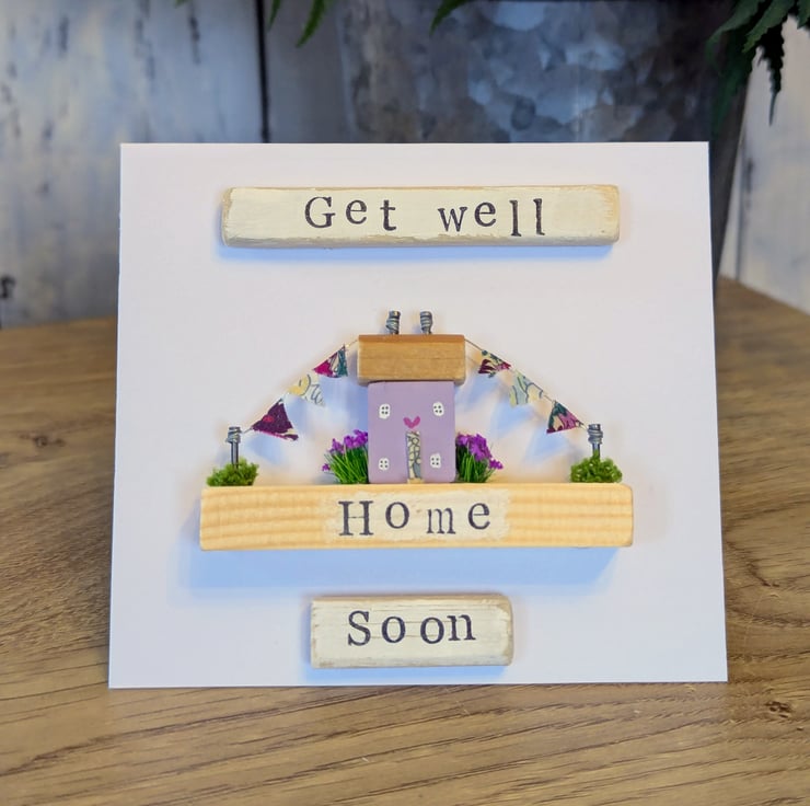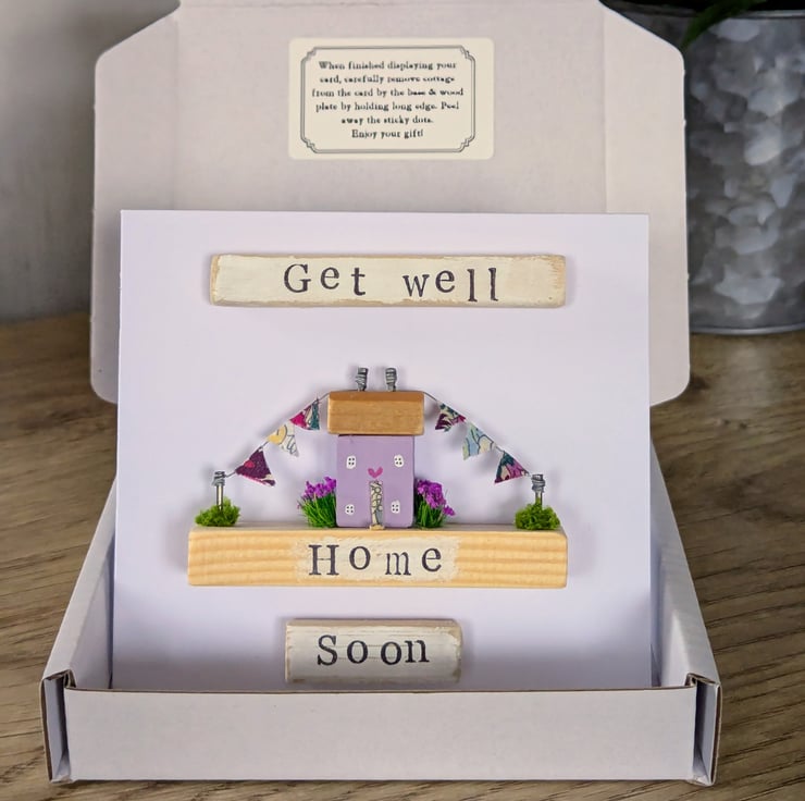 The card has a hand stamped 'Get Well Soon' message on the front of the card and 'Home' on the cottage base.