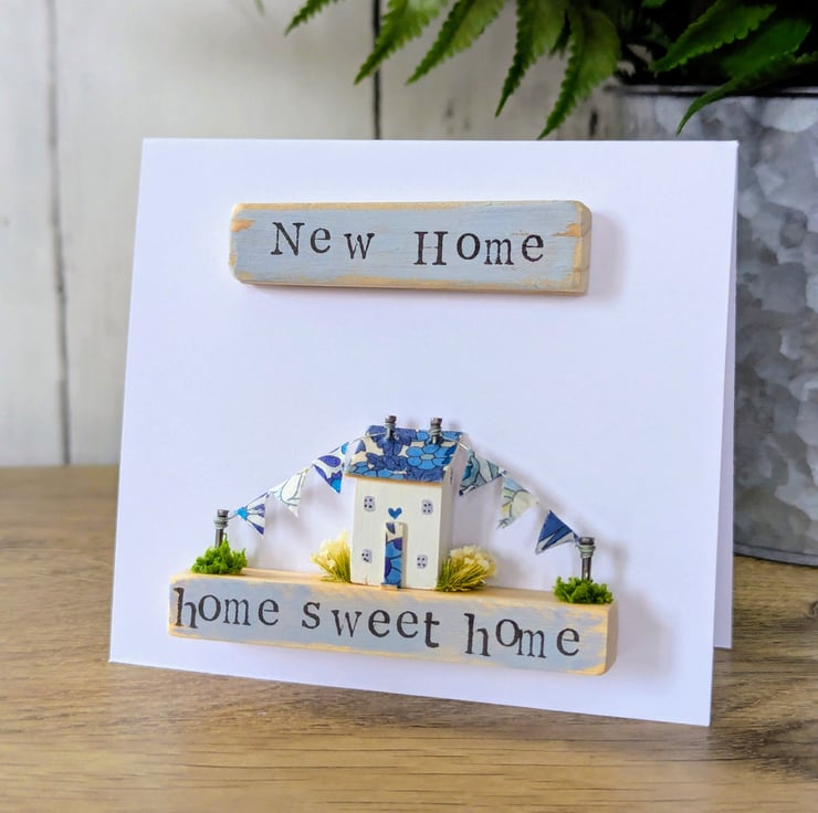 The card has a hand stamped 'New Home' message on the front of the card and 'Home Sweet Home' on the cottage base.