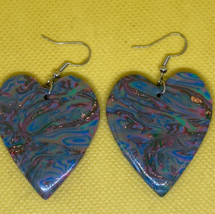 Elevate your style with these vibrant, handmade heart-shaped dangle earrings. Crafted from lightweight polymer clay, each earring features a unique, mesmerising swirl pattern with a glossy finish. The multi-colour design includes shades of blue, green, pink, and purple, ensuring they complement a wide range of outfits.
