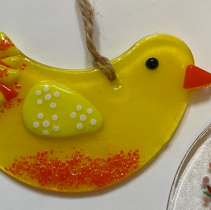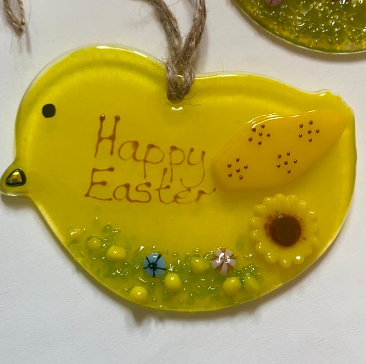 These Easter themed hanging decorations are individually handmade using glass paint, powders and hand cut glass elements. Just through available - an Easter chick with a flower theme, complete with a shiny beak, a sunflower and a gold handwritten Happy Easter message, measuring 9.5cm by 6.5cm.