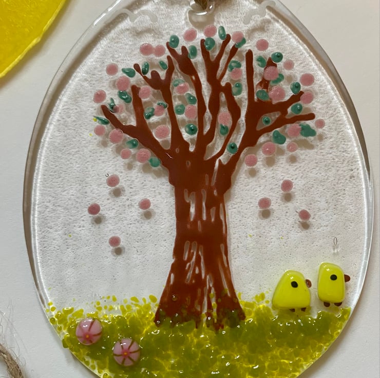 And finally an Easter egg shaped hanging decoration with a hand-painted tree full of blossom and two little yellow chicks in the grass. This one measures 10cm by 7.5cm.