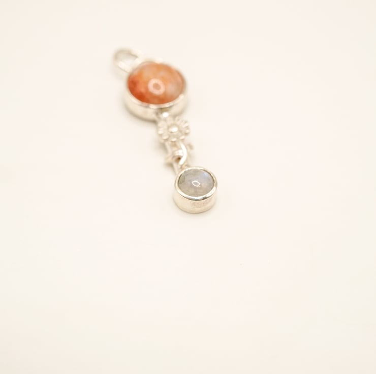 Handmade sterling silver sun and moon pendant featuring a luminous moonstone and a warm, sparkling sunstone. The two elements are joined with a delicate floral detail, adding a soft, nature-inspired touch. Elegant and balanced, with a subtle celestial feel.