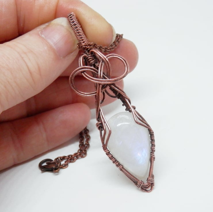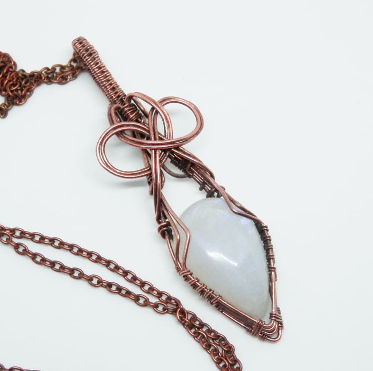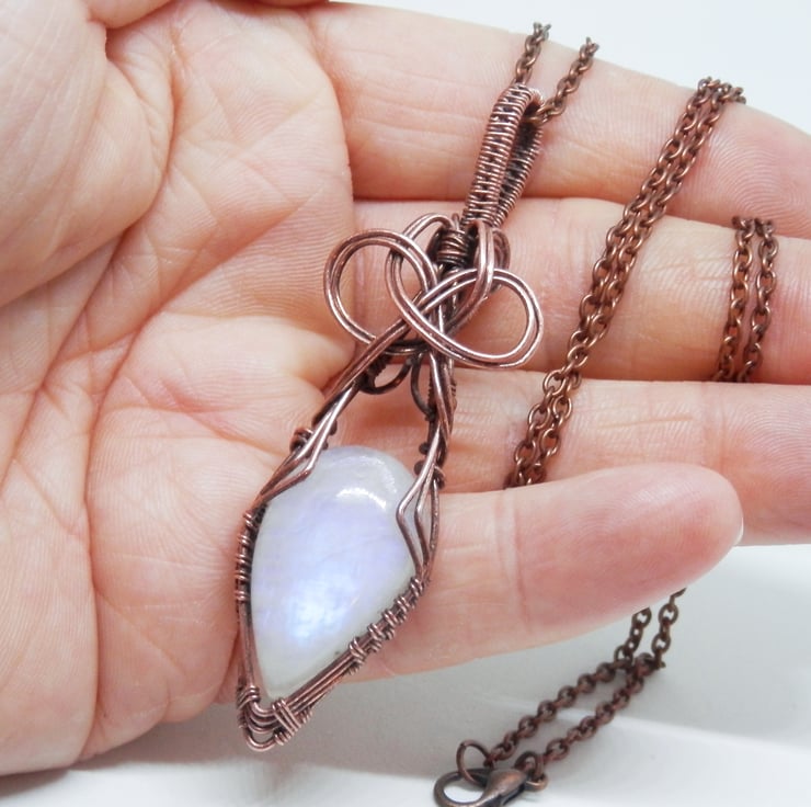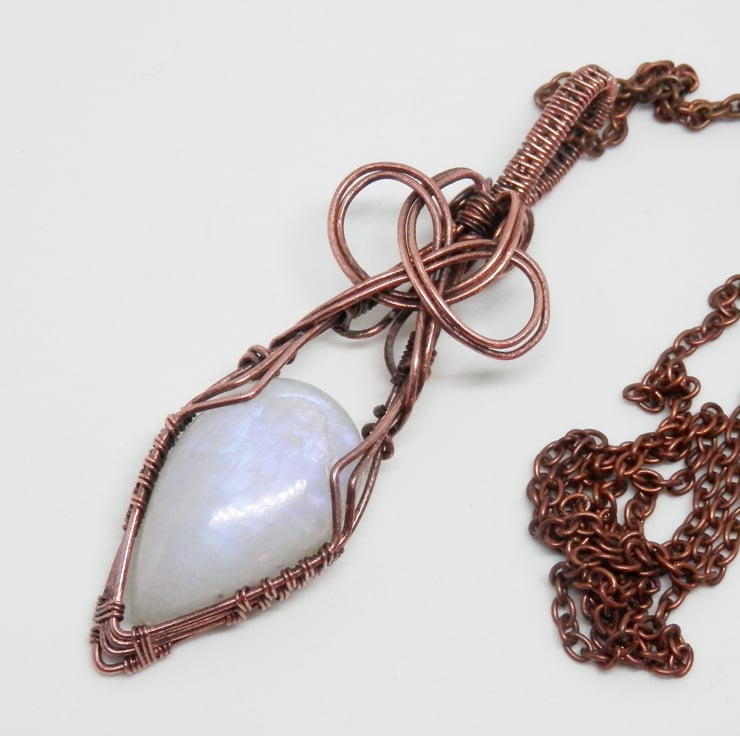 This is a lovely wire wrapped Necklace, made using copper wire that has been wrapped in a Celtic style around a teardrop shaped piece of Rainbow Moonstone that flashes in the light. With added Celtic Knot detail at the bail.