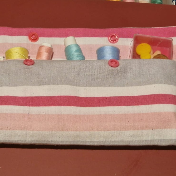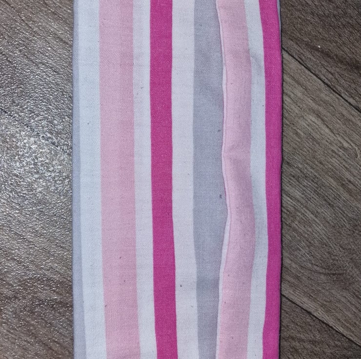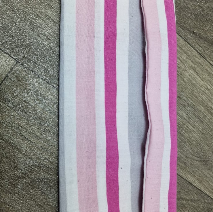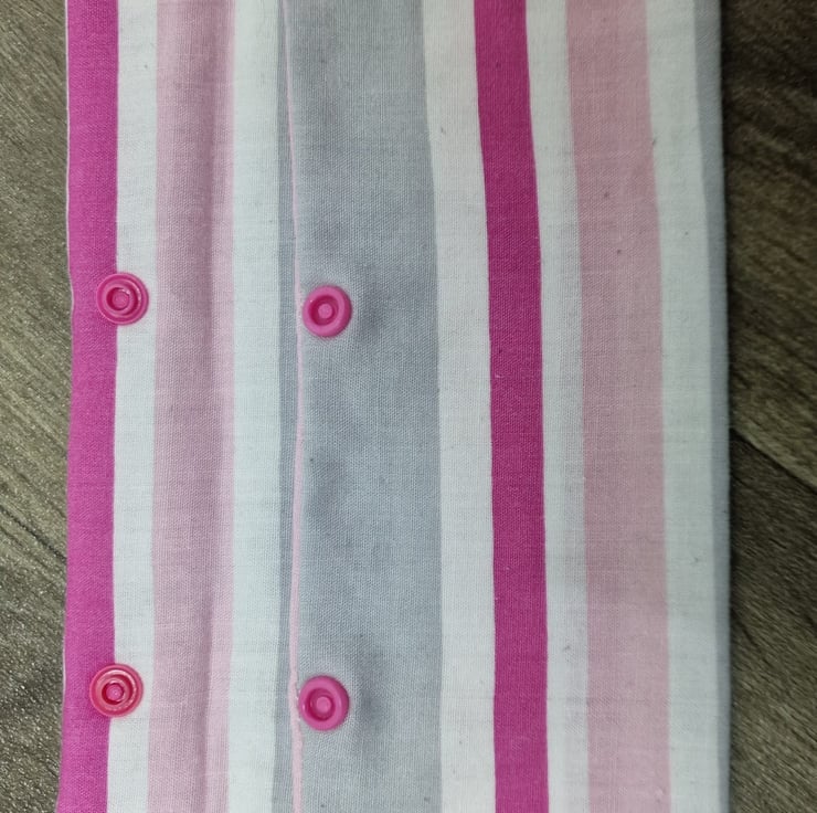 23.5cm x 9.5cm pink, white and grey striped pencil case with plastic popper buttons.