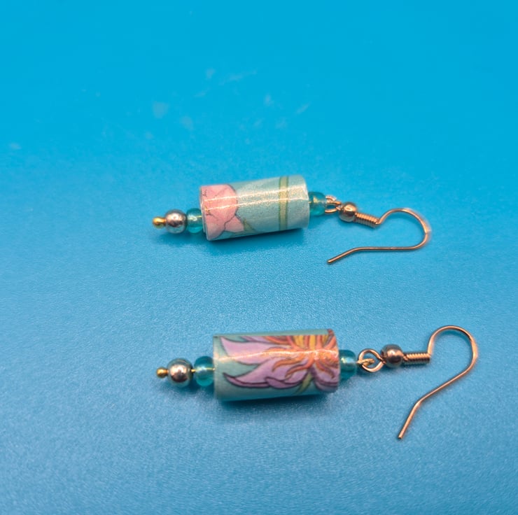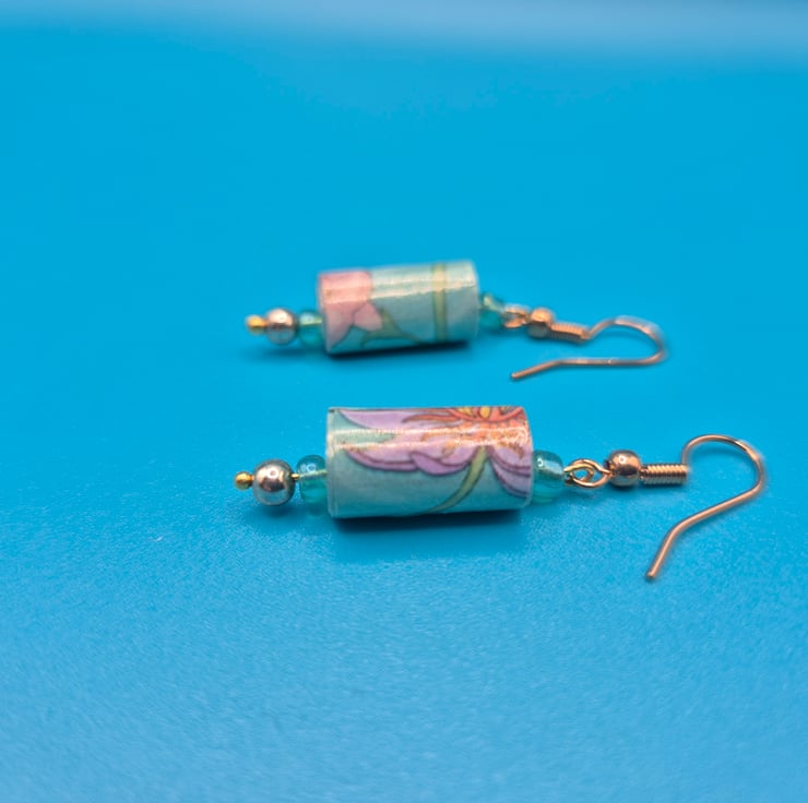 I used a scrap of recycled pretty flowery paper with pastel tones to make those dangling earrings. The handrolled paper beads were complemented with small round delicate preloved beads.