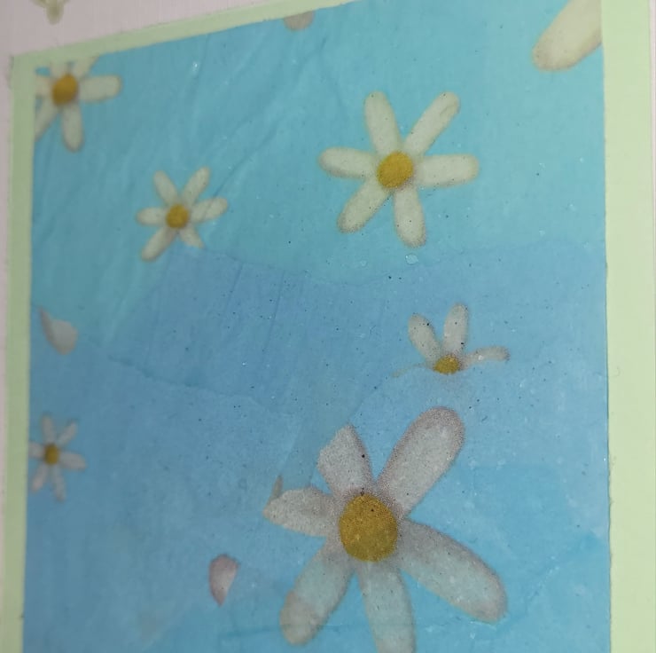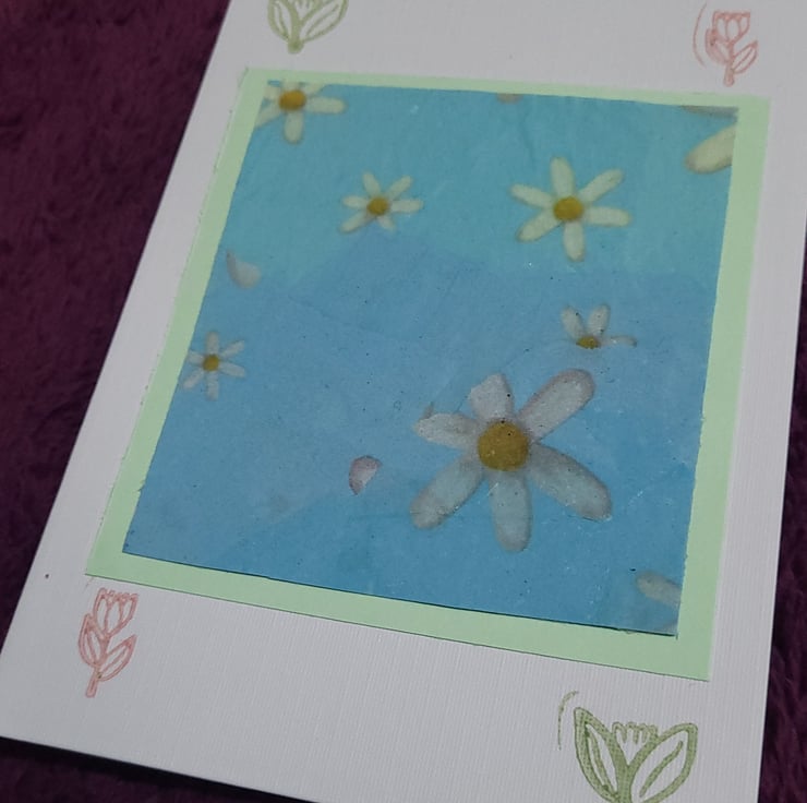 Spring themed handmade blank card glossy tissue paper design mounted on a pastel green card, onto an A6 white card. With ink stamps of spring flowers.