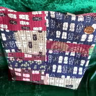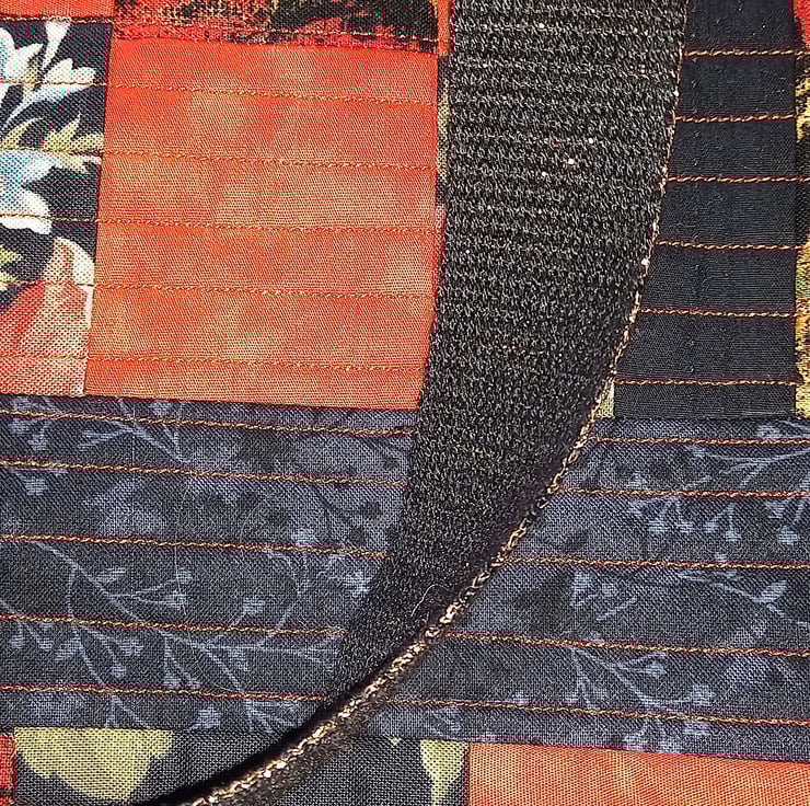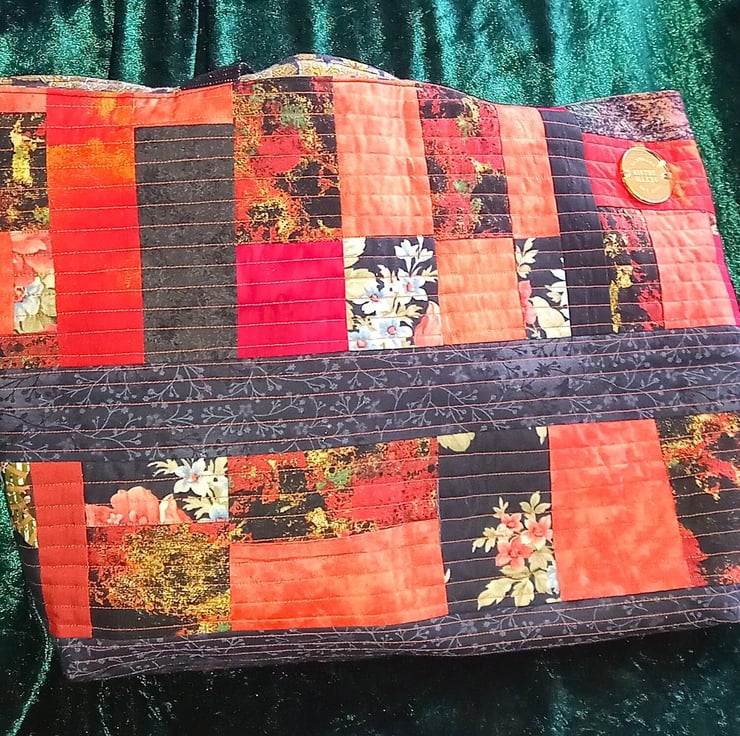 Handmade quilted patchwork tote bag in a variety of striking orange and black fabrics. This bag is a one off and would definitely brighten up your day and would be perfect for a shopping trip somewhere special.
