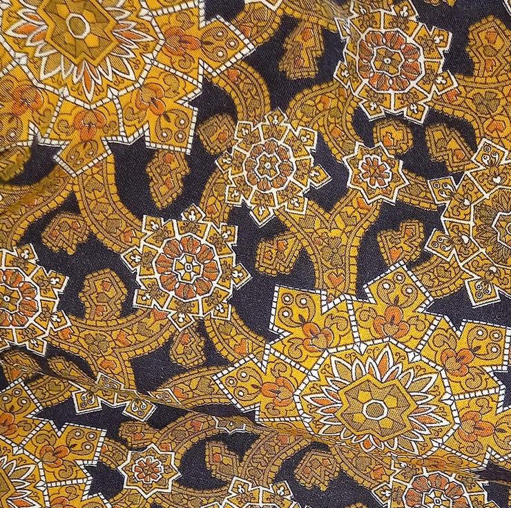 The lining is a very unusual black, orange and yellow geometric pattern. Straps are black webbing with gold flecks.