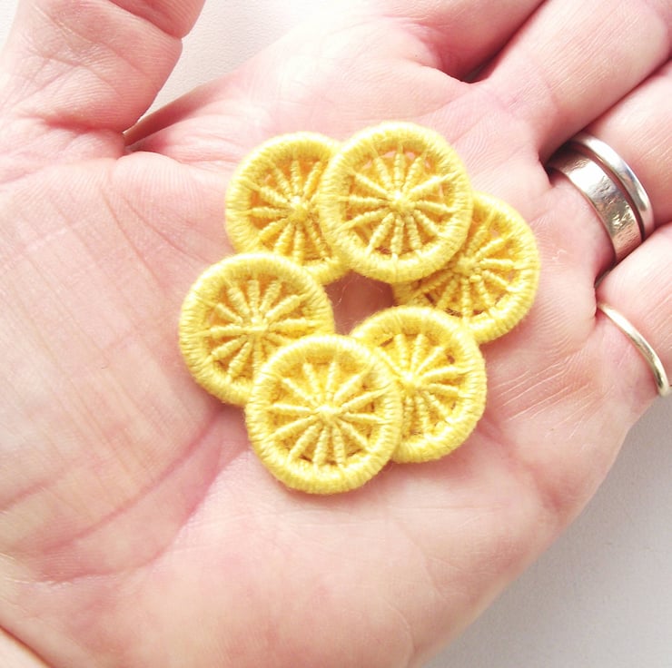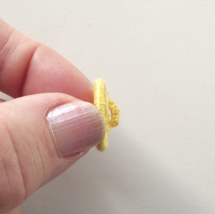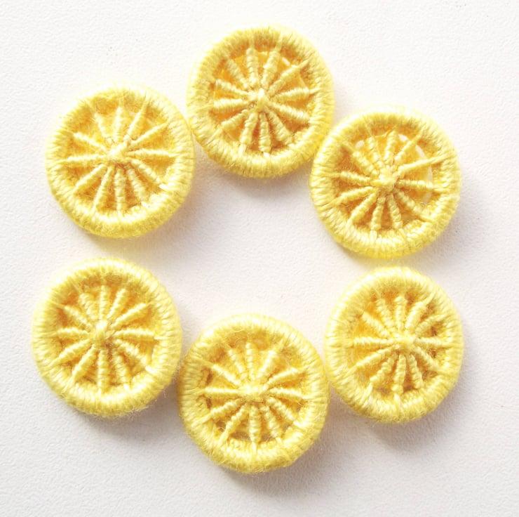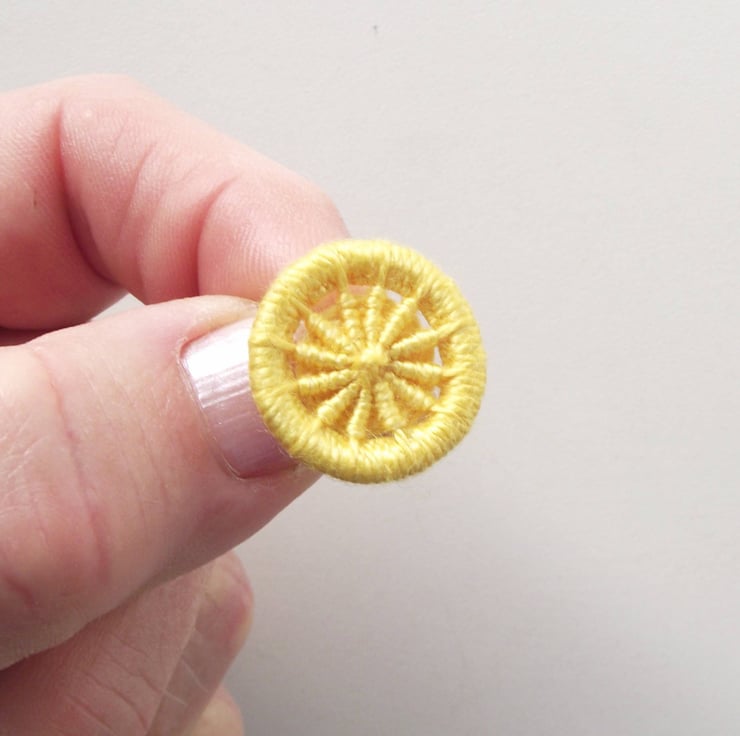 I used a mid yellow cotton thread and brass rings to make this set of six 2cm