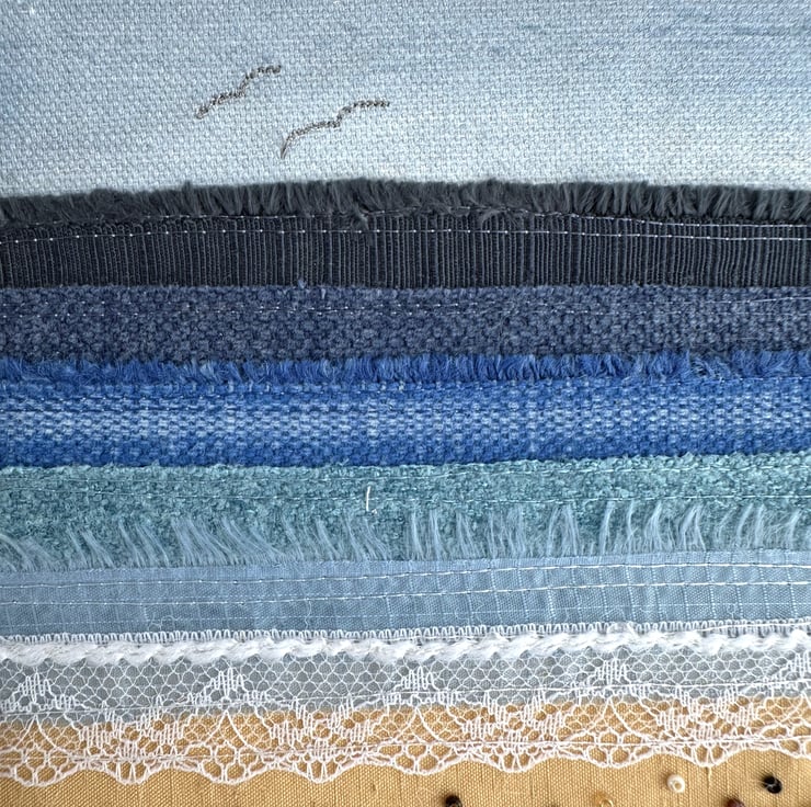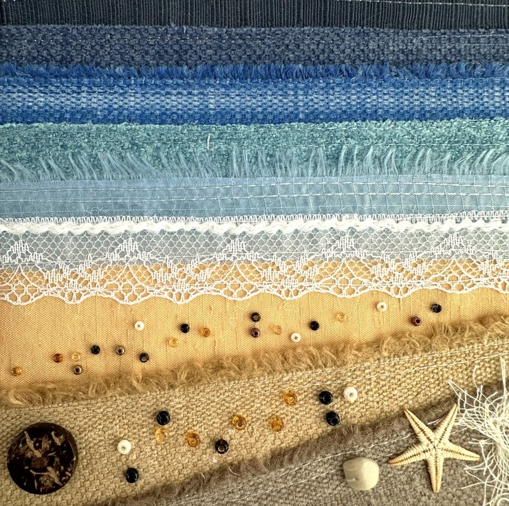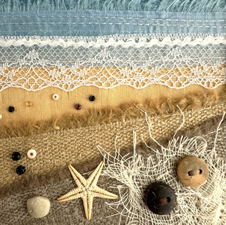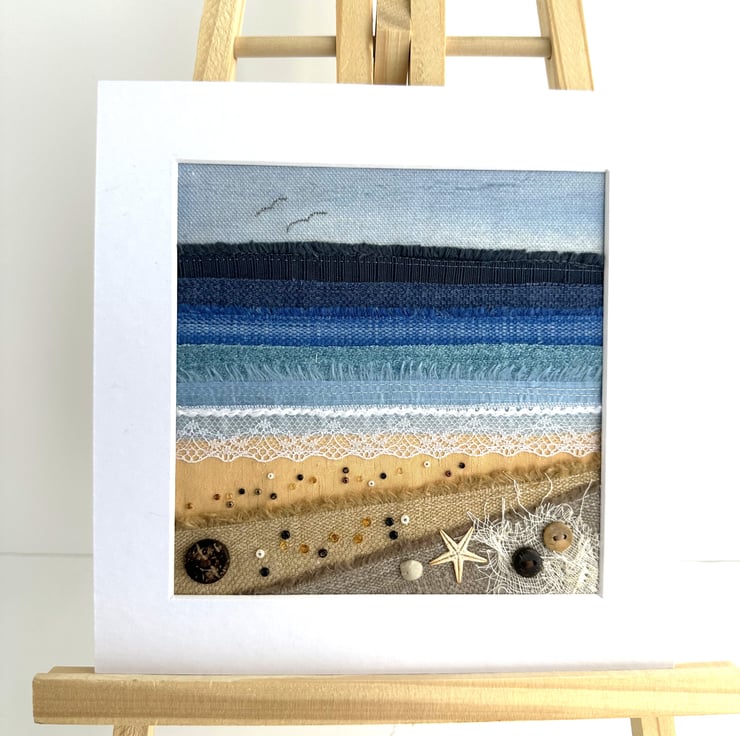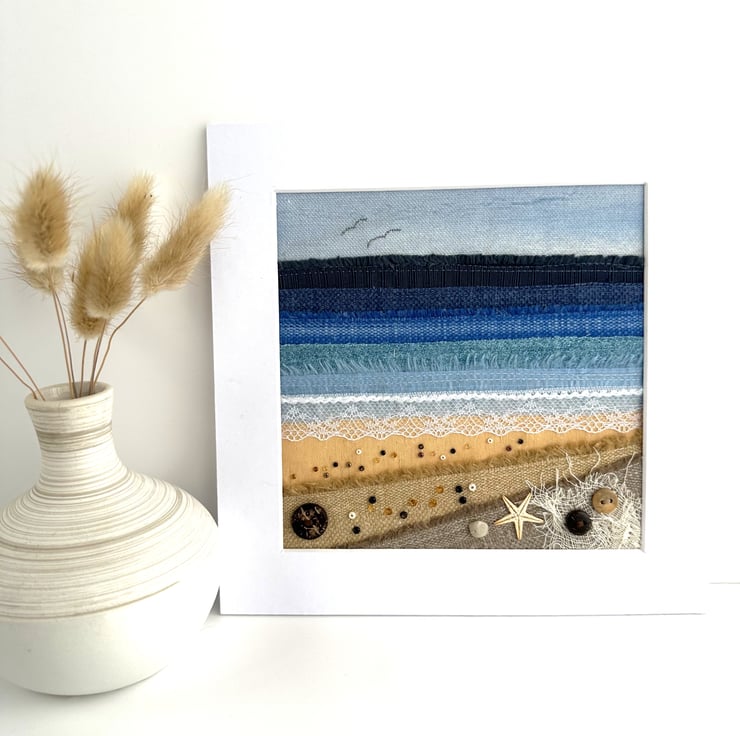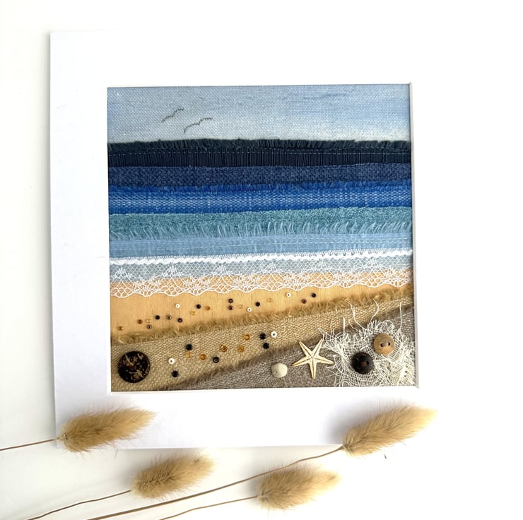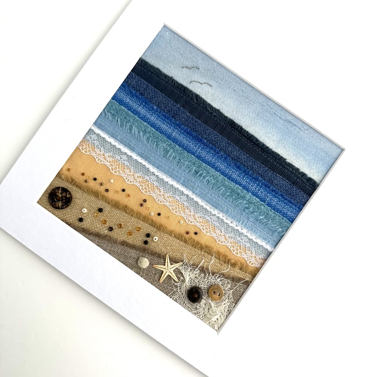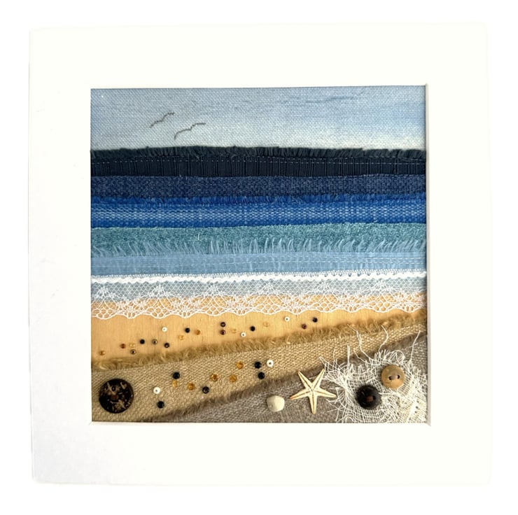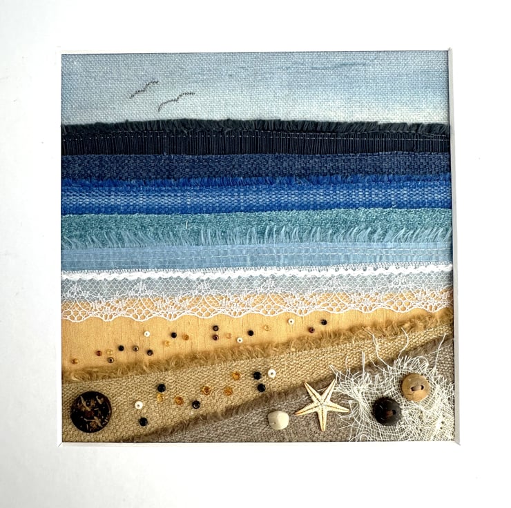 Golden Beach is a piece of mounted textile art depicting the sea and a golden sandy beach under a blue sky. The seascape piece is made by layering a variety of different fabrics. The sky is a piece of streaked pale blue fabric on which I've used free-motion embroidery to add some seagulls. The sea consists of layers of different fabrics and selvedge edges in many shades of blue, along with crinkled yarn and lace. The sandy beach is made from golden yellow fabric along with two strips of fabric with selvedge edges in taupe and golden-brown. I've added scattered seed beads as pebbles, a starfish shell, a gemstone chip, some crumpled and frayed cream muslin and three coconut shell buttons. The artwork is mounted on a square acid-free backing board, finished with a white aperture mount, and is ready to be framed. It is presented in a cellophane sleeve for protection.