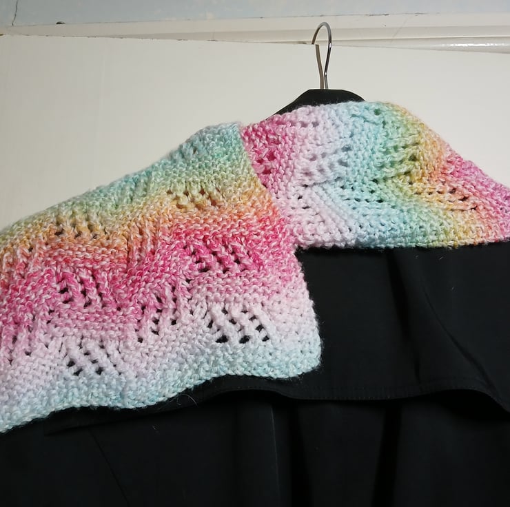 This listing is for a Rectangular Scarf knitted in a lace pattern from pink, orange, yellow, green and blue (neon and pale) yarn.The shawl is 25cm wide, and 160cm long.