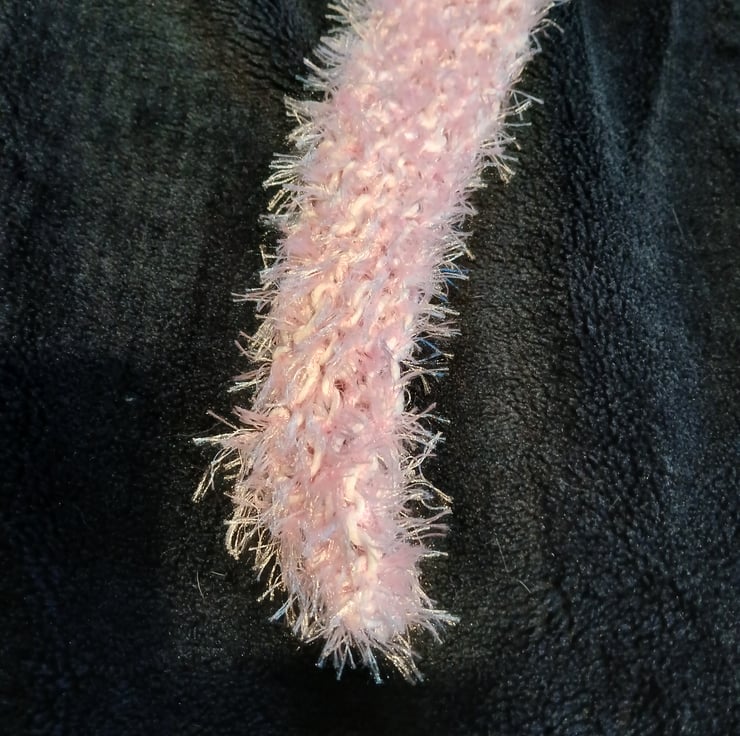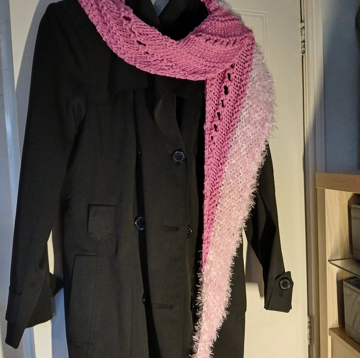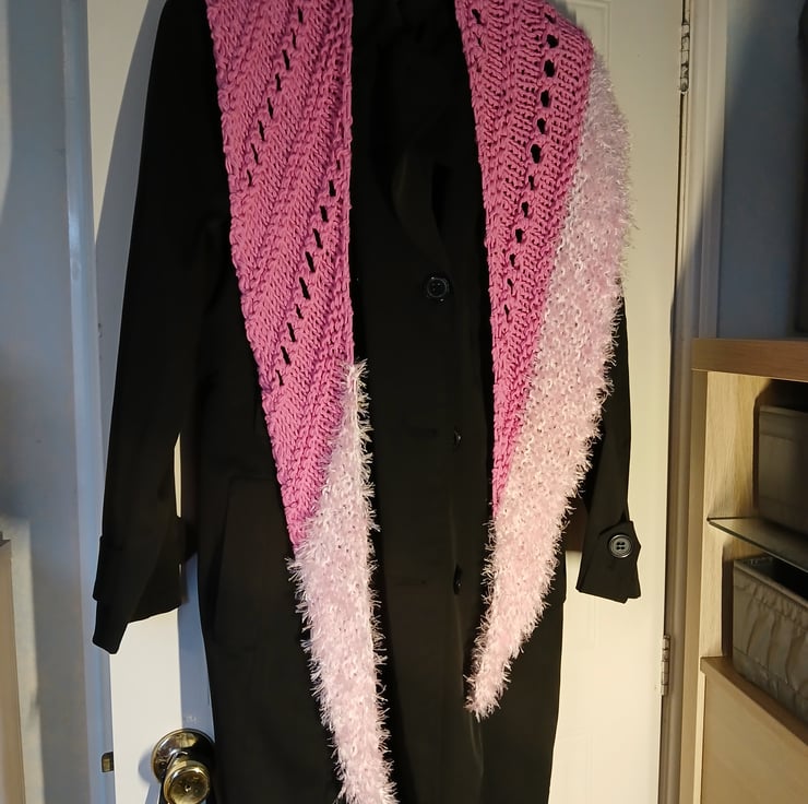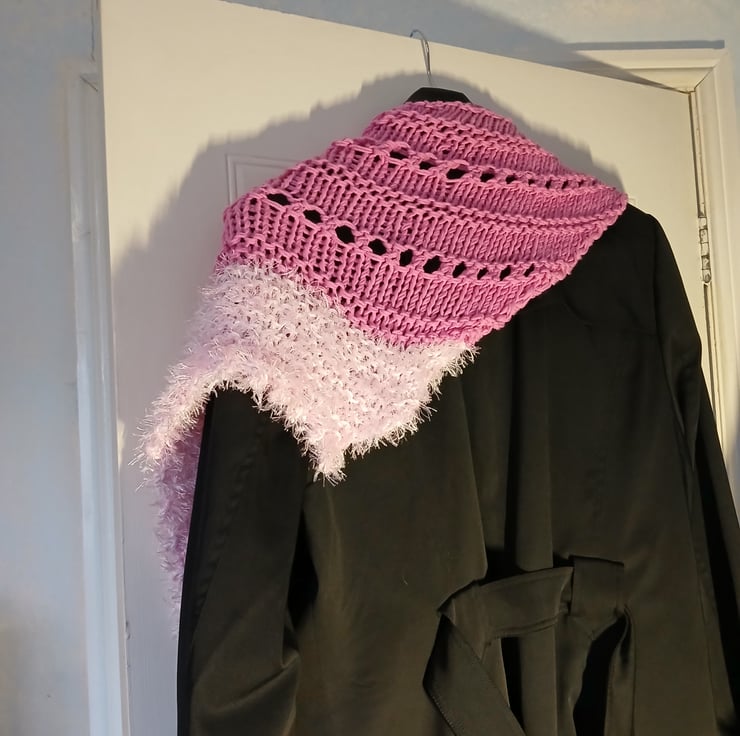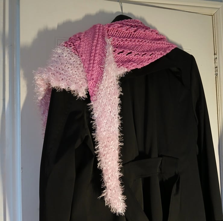 This listing is for a Asymmetric Triangular Scarf created from a pink and white cotton yarn with pale pink tinsel yarn trimming.