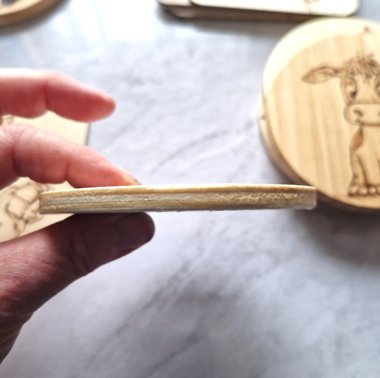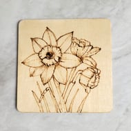 A cute cartoon dragon coaster that has been been hand drawn and then hand burned using a pyrography pen. The entire coaster was then sealed in several coats of clear polyurethane varnish for protection.
