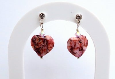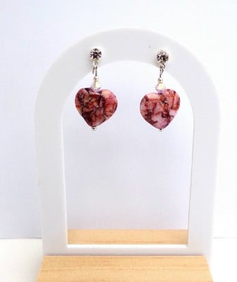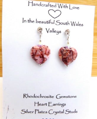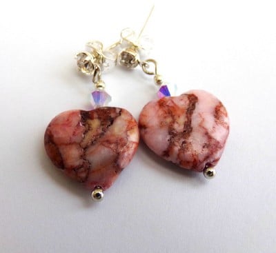 Pretty and feminine handmade earrings featuring semi-precious gemstone rhodochrosite hearts in a beautiful shade of pink with natural colour veining attached to crystal studs with silver plated butterfly scroll backs.