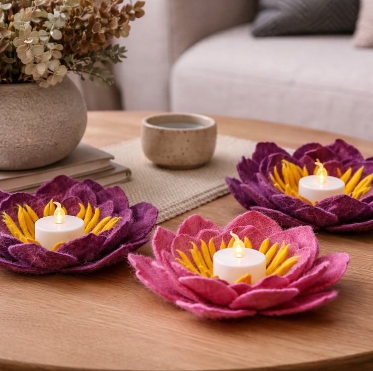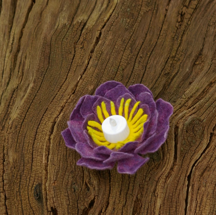 This felted wool candle holder is crafted in the shape of a flower with a diameter of approximately 18 cm. The rich purple petals are arranged in layered form, creating the effect of a blooming flower. At the center sits an LED candle, surrounded by a decorative yellow wool “core.” The soft, warm light highlights the texture of the material and creates a cozy, inviting atmosphere. The candle holder is safe to use thanks to the LED candle and makes a stylish decorative piece for any interior.