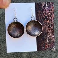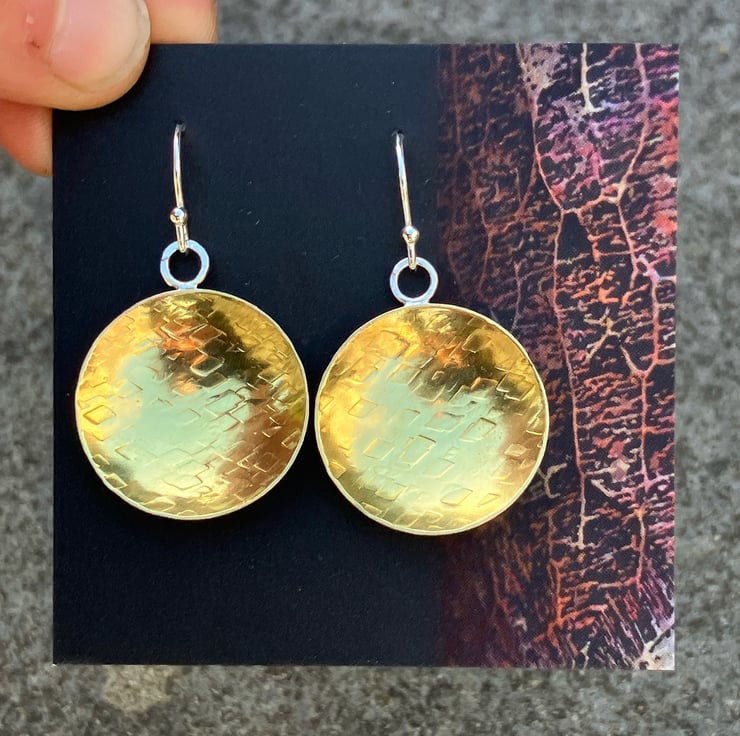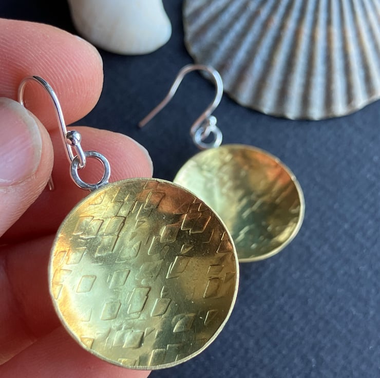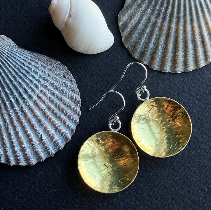 Brass bowl dangle earrings with sterling silver hooks. Textured brass dangle earrings.