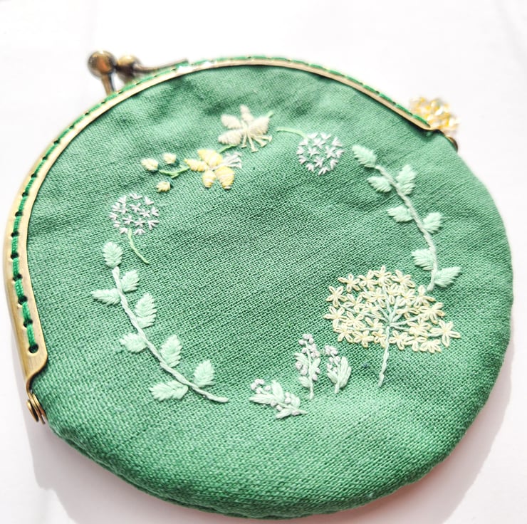 The front features a delicate floral wreath design, carefully stitched by hand. The rounded shape gives the purse a slightly unusual and charming silhouette.