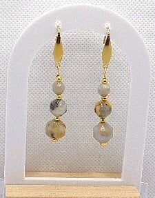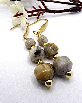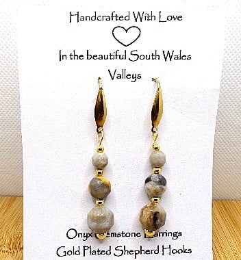 Handmade earrings featuring semi-precious gemstone onyx earrings in calm neutral shades. with beads varying in size ranging from 10mm,8mm. and 6mm.With gold plated spacer beads and gold plated shepherd hooks.