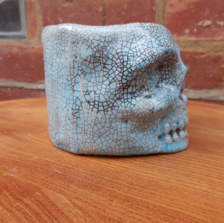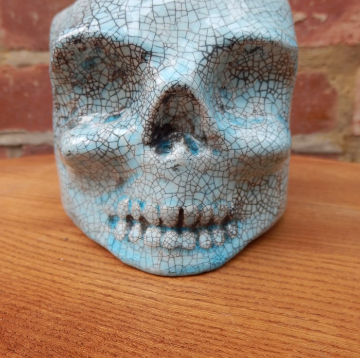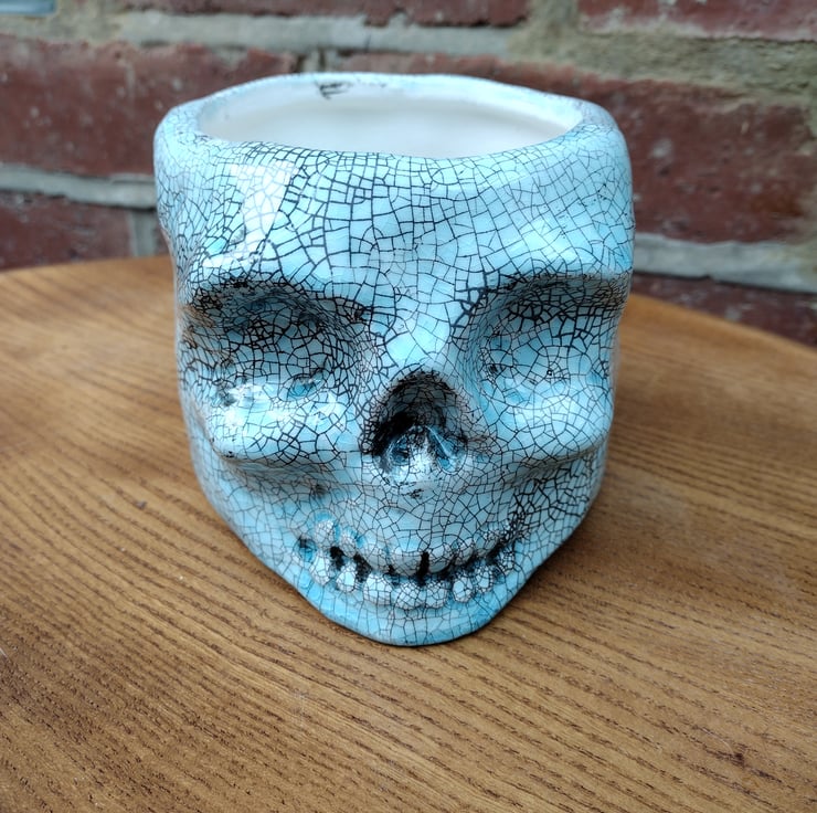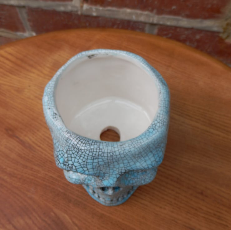 Ceramic skull plant pot with a turquoise crackle glaze. The pot has a drainage hole.