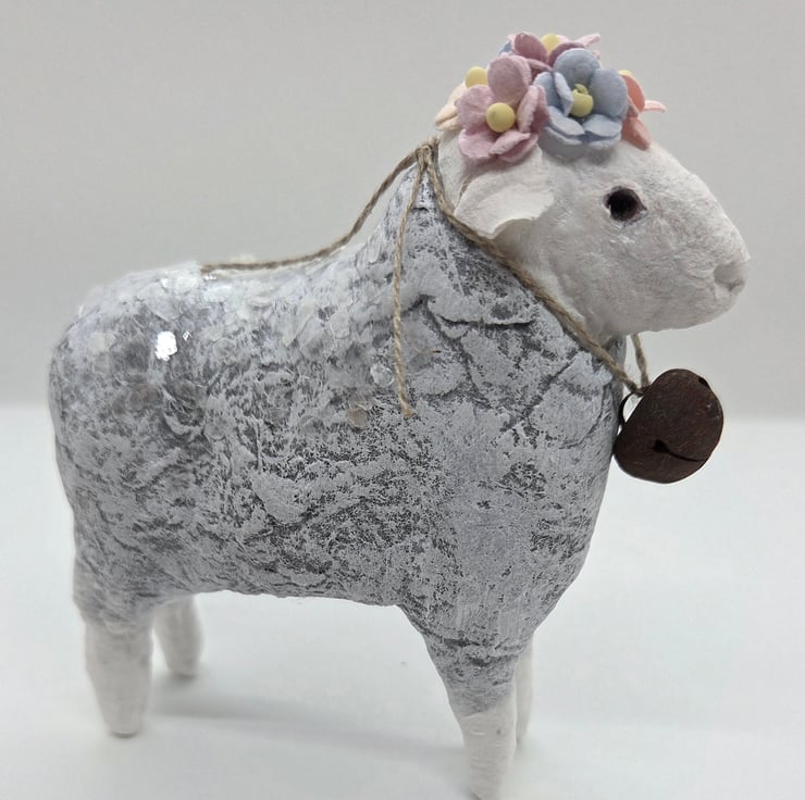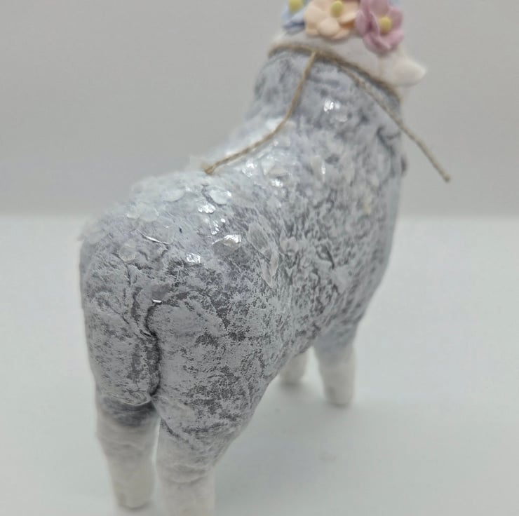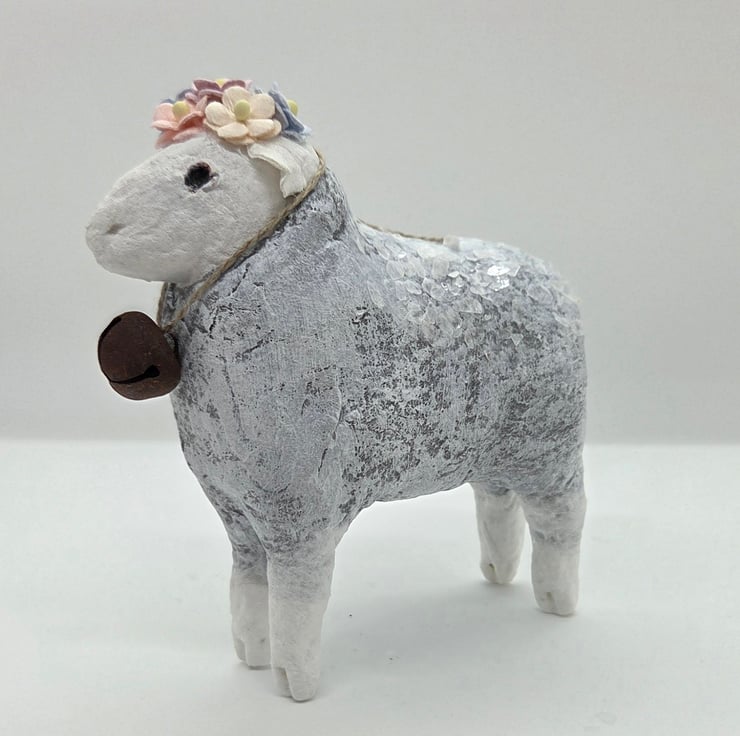 She is about 11cm tall and 9cm long and freestanding (but I can add a hanger if you prefer). This little sheep has a pretty flower crown and wears a small rusty bell around her neck. A little extra sparkle has been added - a few shimmery mica flakes adorn her back.