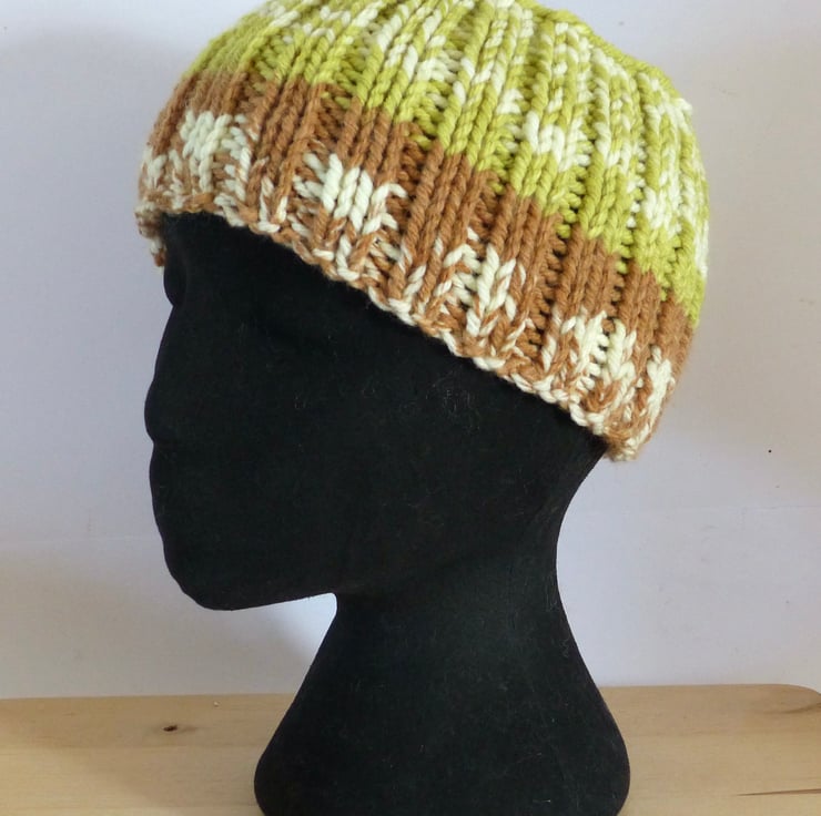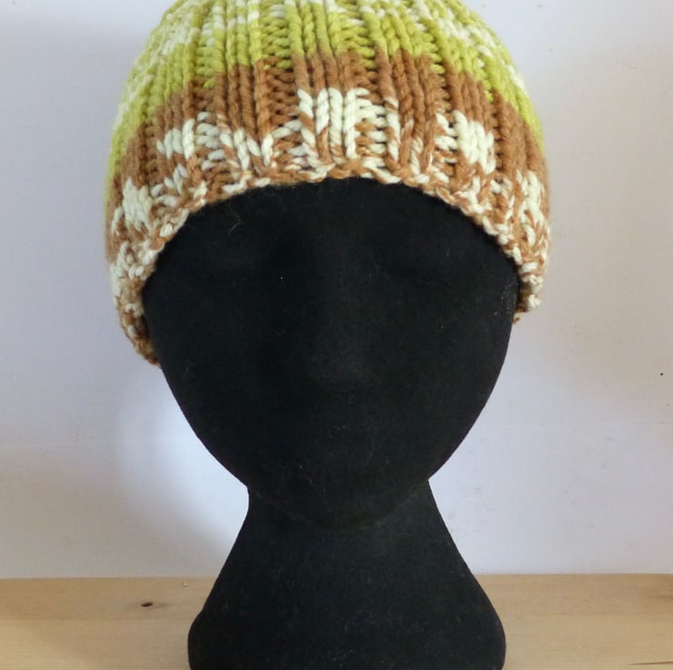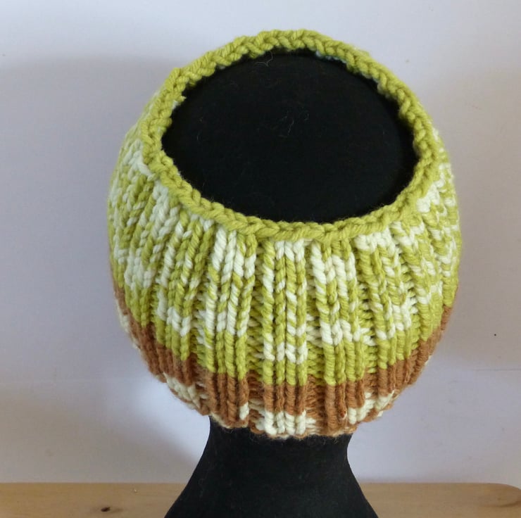 A hand knitted Headband in a chunky yarn which is 20% Merino Wool and 80% Acrylic so lovely and warm. The yarn is self patterning in a random Fairisle design and the colours are Bright Green, Brown and Cream. As I have knitted this in a rib pattern it has plenty of stretch so should fit most adult heads and it is approximately 5" wide. Ideal for a Winter Walk to keep your ears snug.