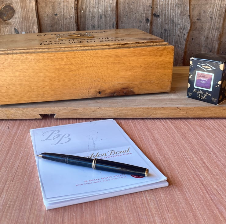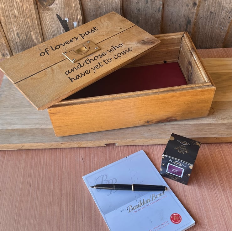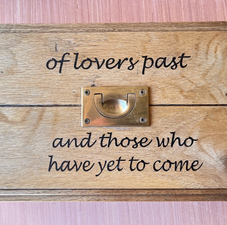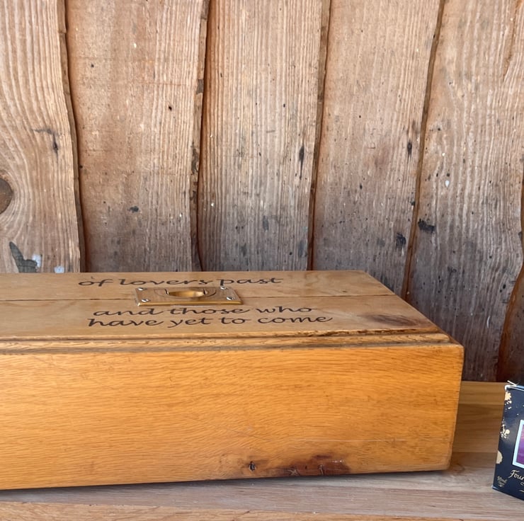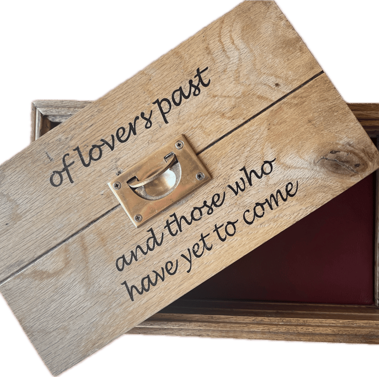 A polished wood box made from salvaged T&G Oak flooring with a brass handle. Inside is a soft red leather liner. On the lid is a message to cause intrigue. For letters, mementoes, secrets