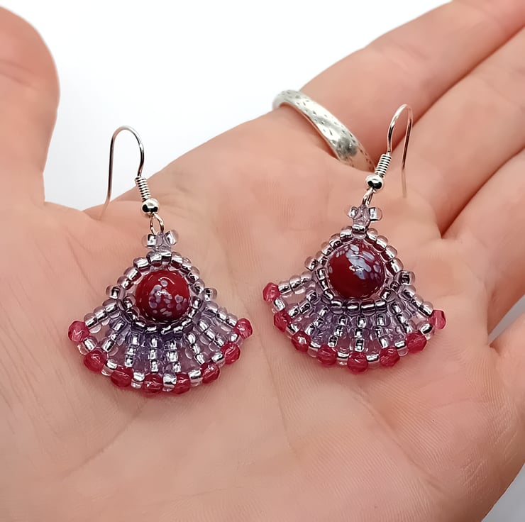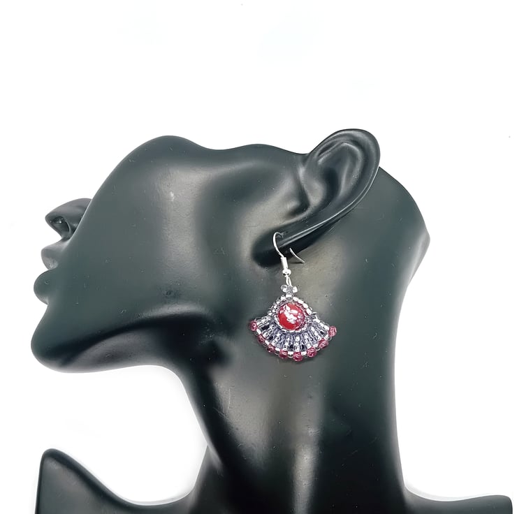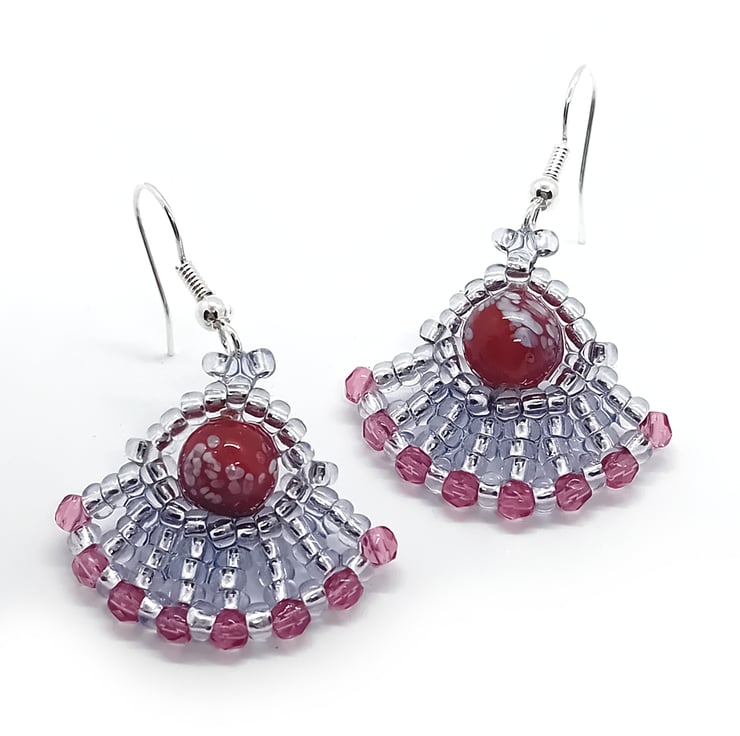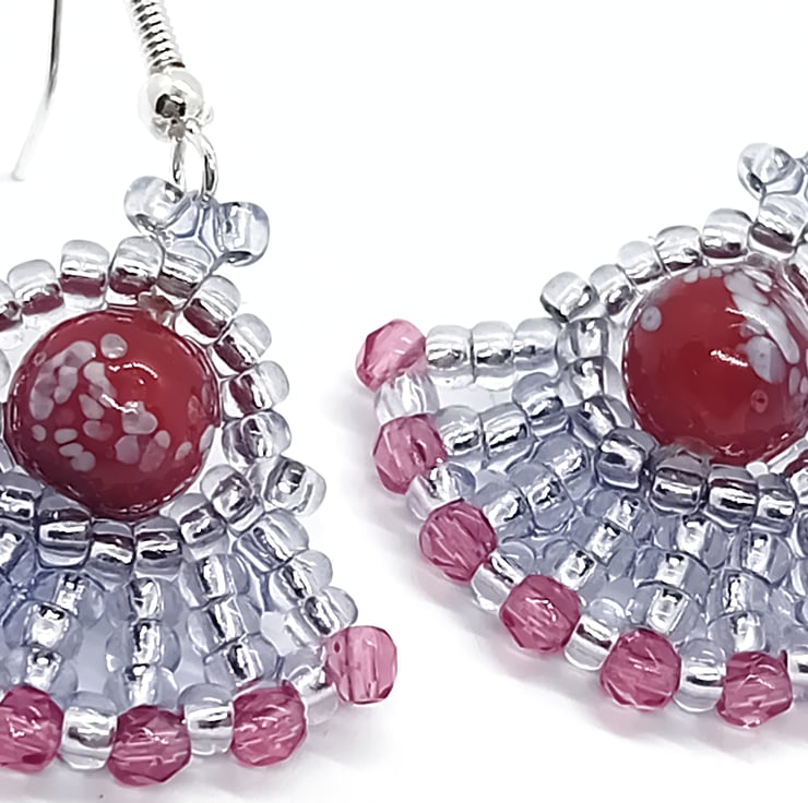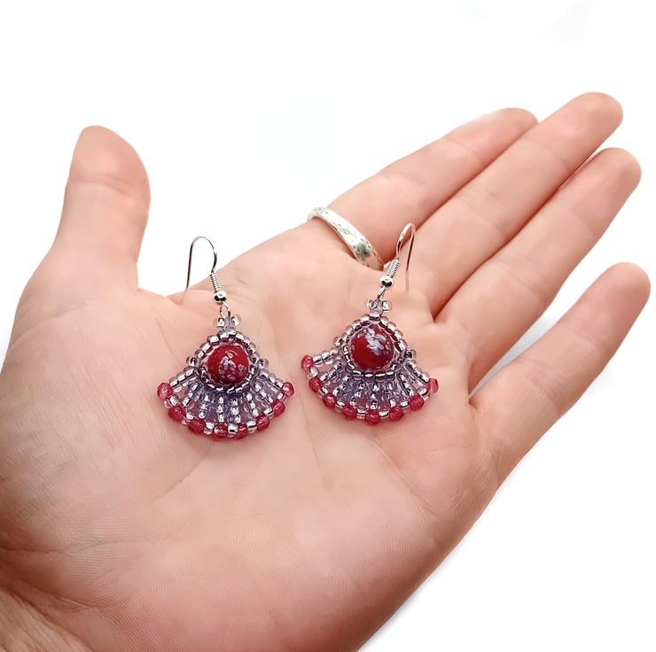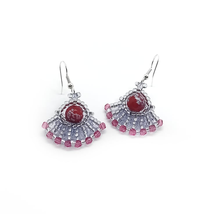 These striking red and ice blue beaded fan earrings are carefully made using ice blue seed beads, red accent beads and silver plated ear wires.