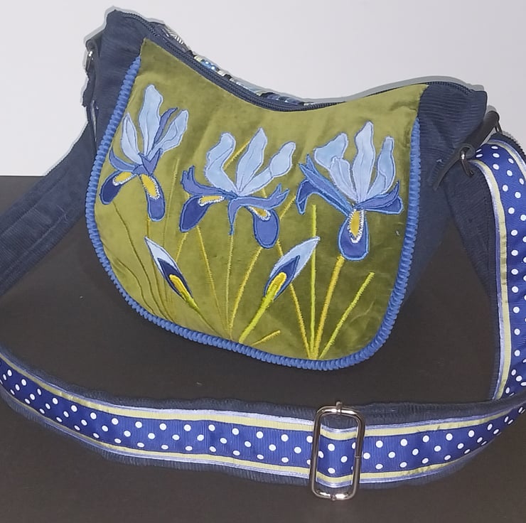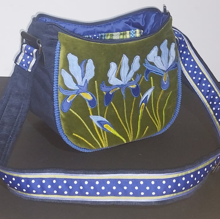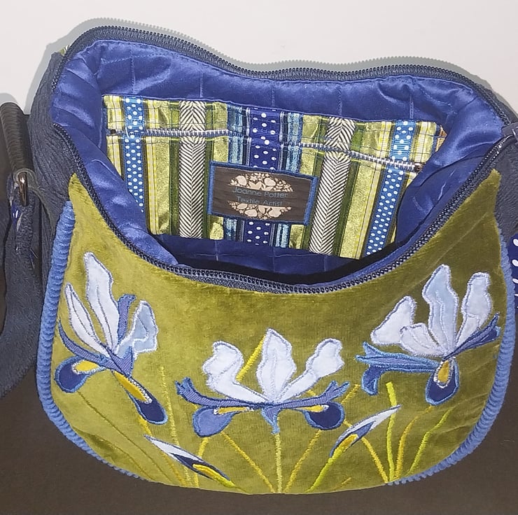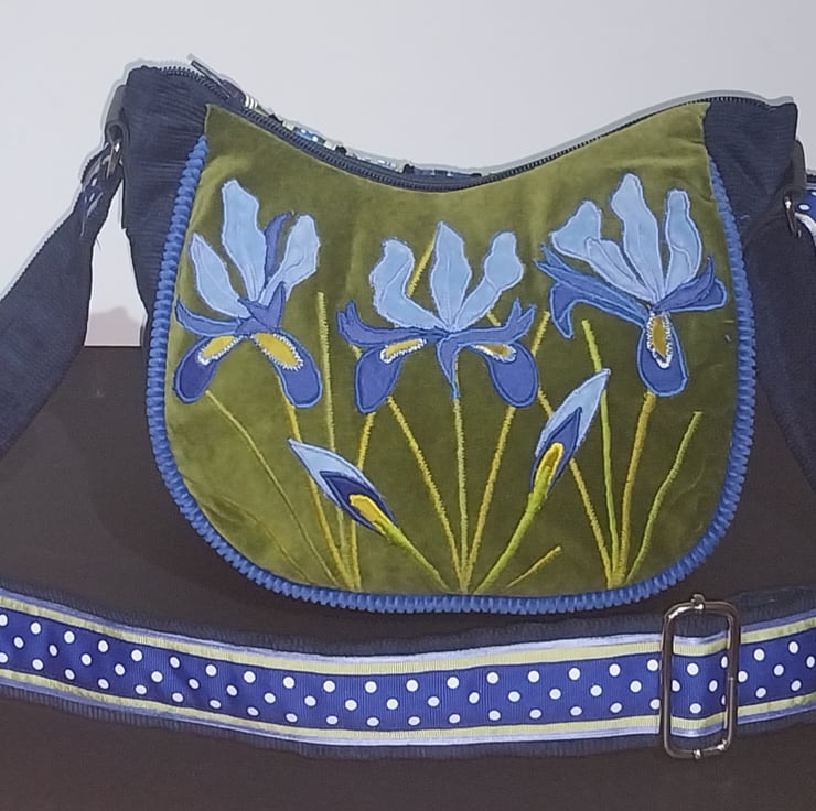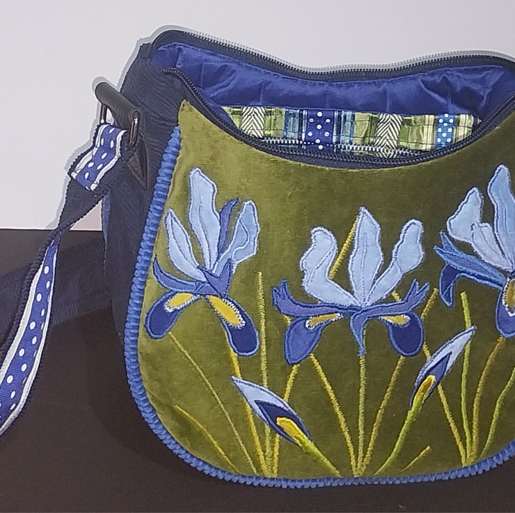 This unique new handbag is made from a soft green velvet over laid with three different shades of blue fabric and zig zag stitching to create bold and vibrant Irises.