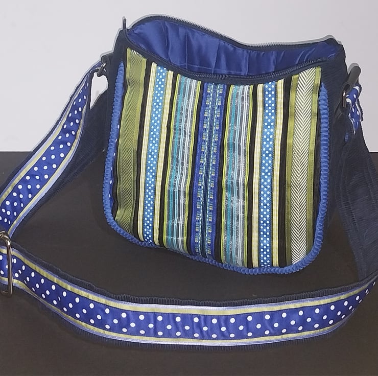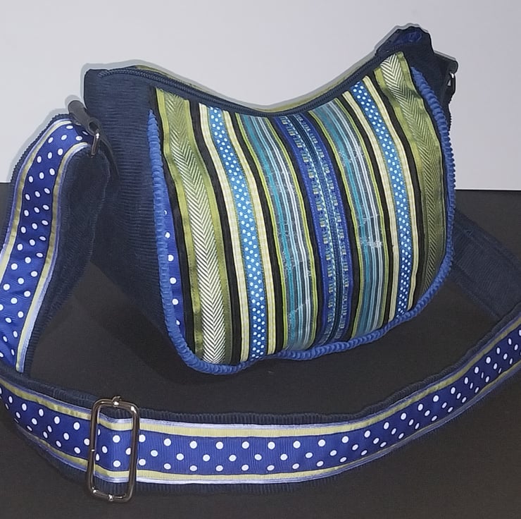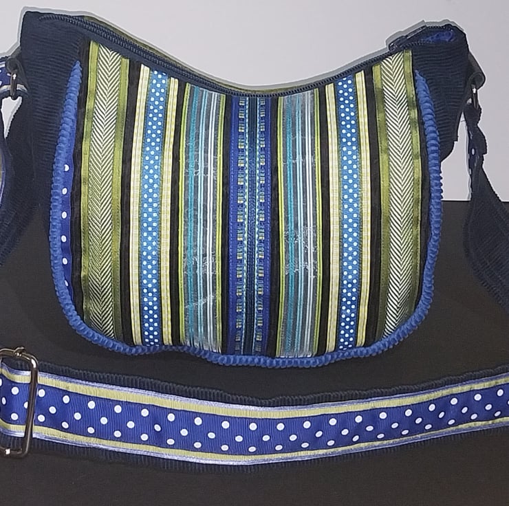 This has been created with a black corduroy fabric over laid with many different ribbons to create a fun pattern.