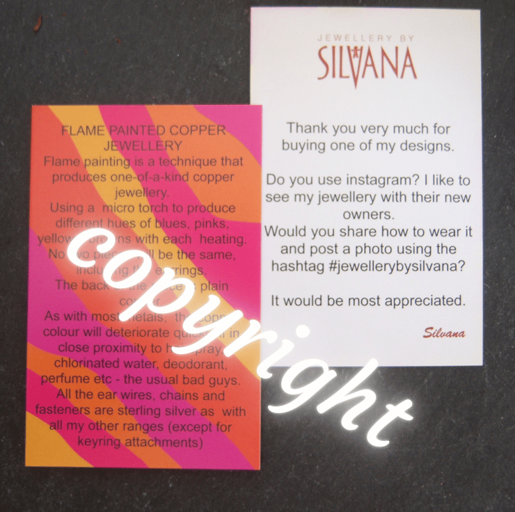 All my jewellery listed here is sterling silver except for the silver plated upcycled cutlery collection. There will be elements of sterling silver in every design (except keyrings and bookmarks), some will be completely so, others may have combinations of copper, brass, bronze, glass, enamel, pewter, resin, upcycled biscuit tins, cutlery and pre-decimal coins and/or gemstones as well. Many of the designs are one-of-a-kind.