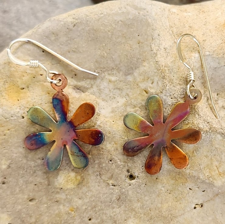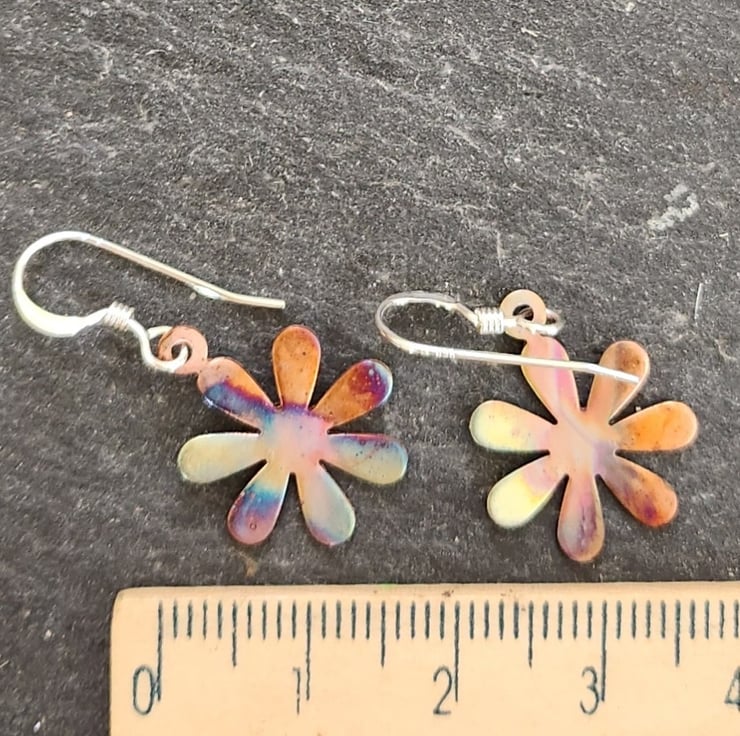 These copper flower earrings are approximately 1.5 cms across. Sterling silver ear wires.