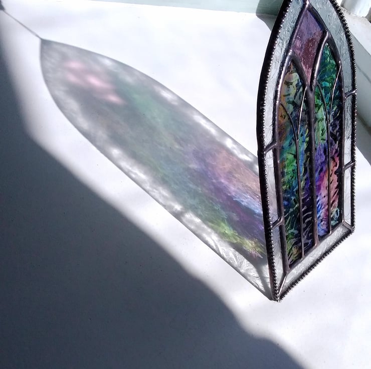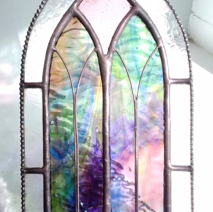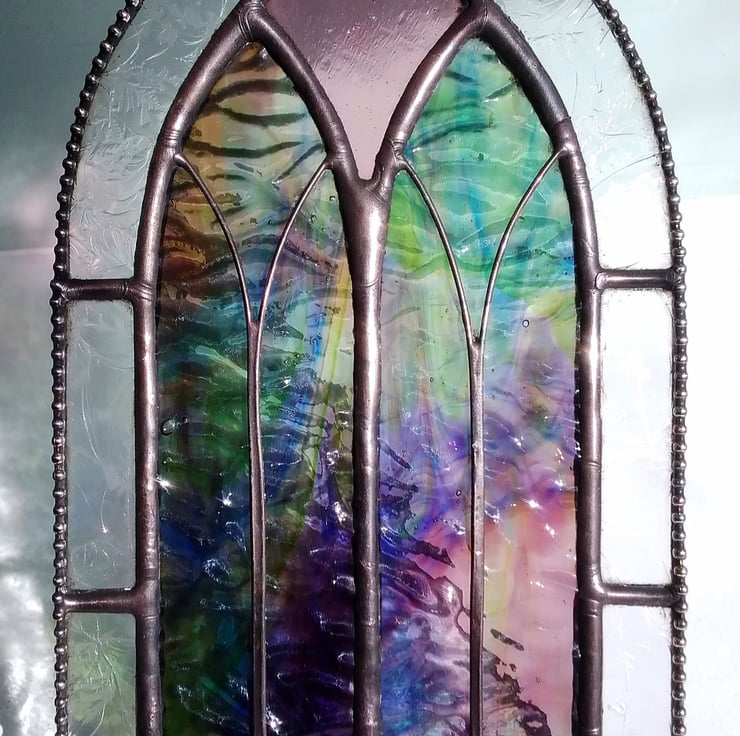 Stained glass cathedral arch handcrafted from ethereal blue, green and mauve wispy textured glass with a frosted 'gluechip' border. Finished with decorative beaded edge and traditional pewter solder. Ideal to add quiet calm to a spiritual corner or memory garden.
