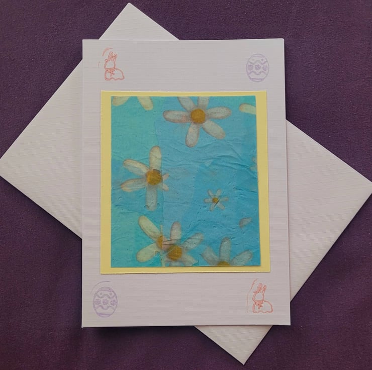 Spring themed handmade blank card glossy tissue paper design mounted on a pastel yellow card, onto an A6 white card. With ink stamps easter designs.
