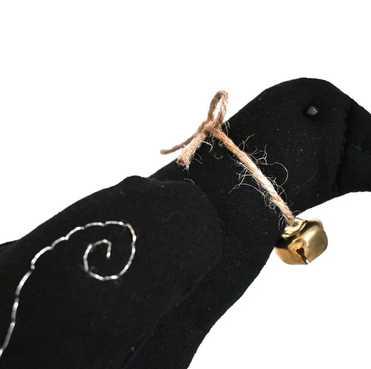 It has been embroidered on the beak and has hand sewn beaded eyes, it has twine and a little brass bell tied in a bow around it's neck.