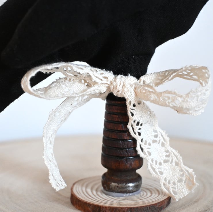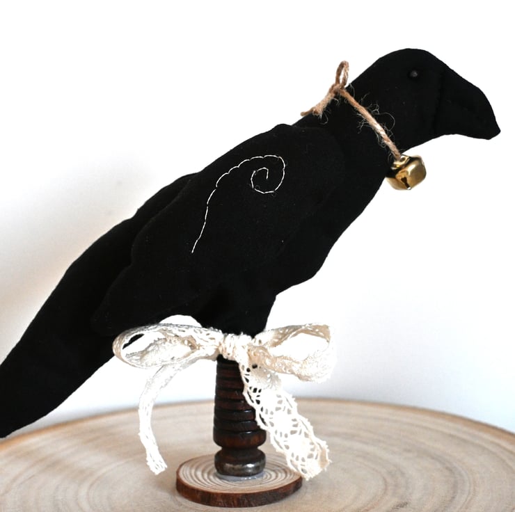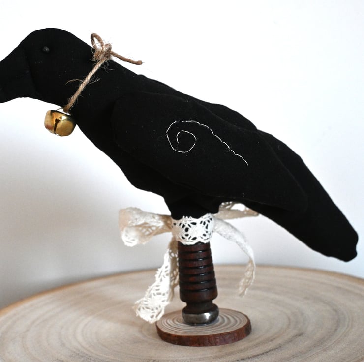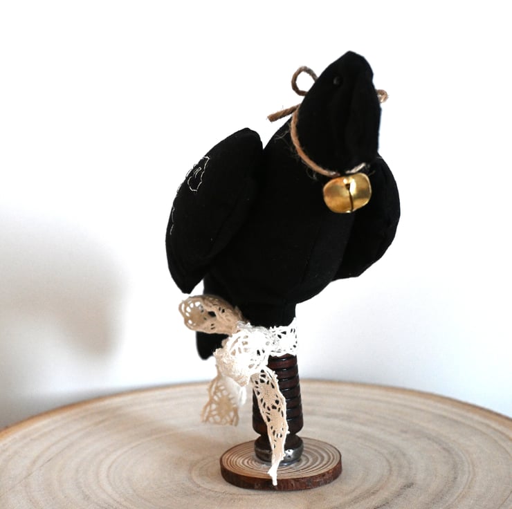 The crow stands on a repurposed wooden bobbin which is attached to a small wood slice. The wooden bobbin features a ivory lace effect ribbon tied in a bow.