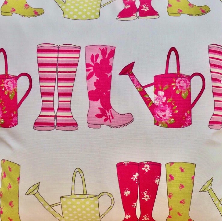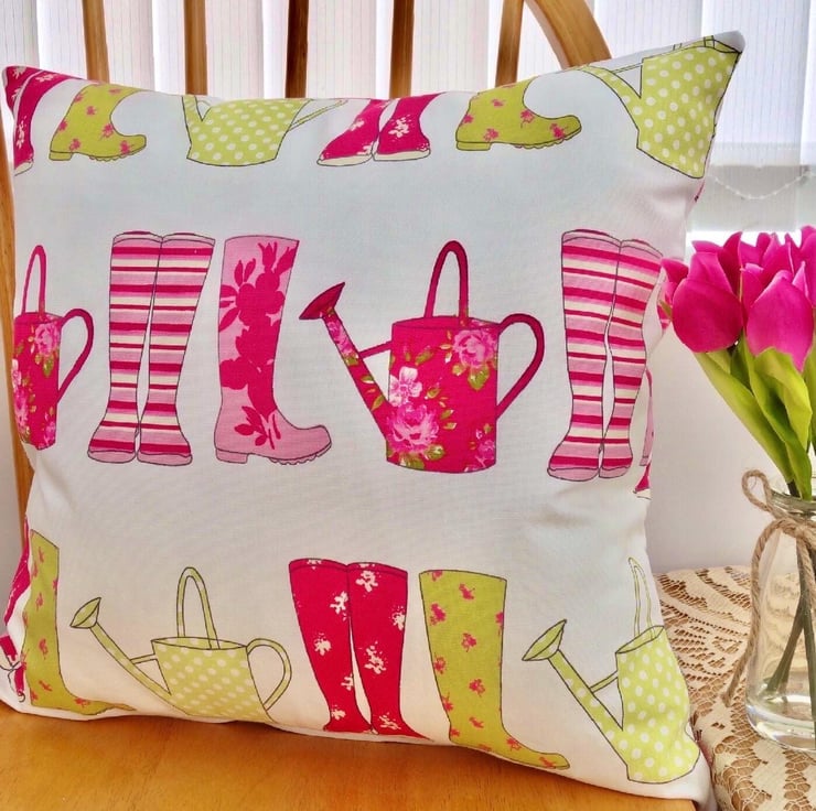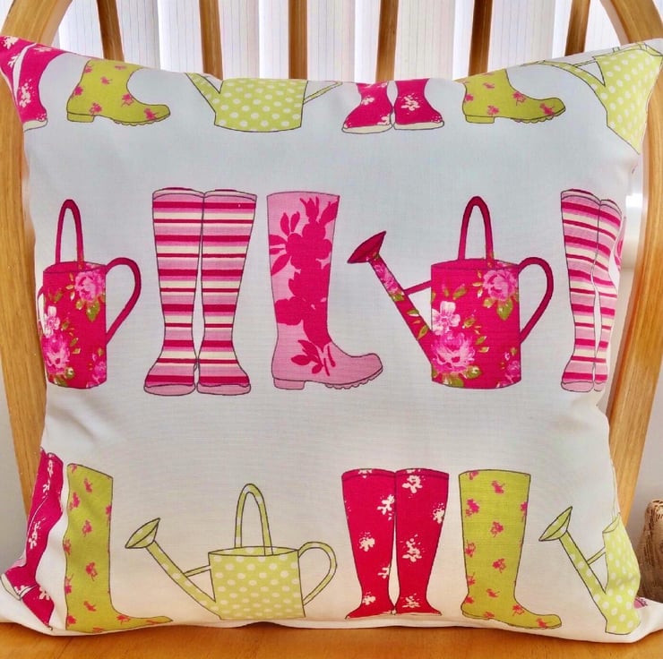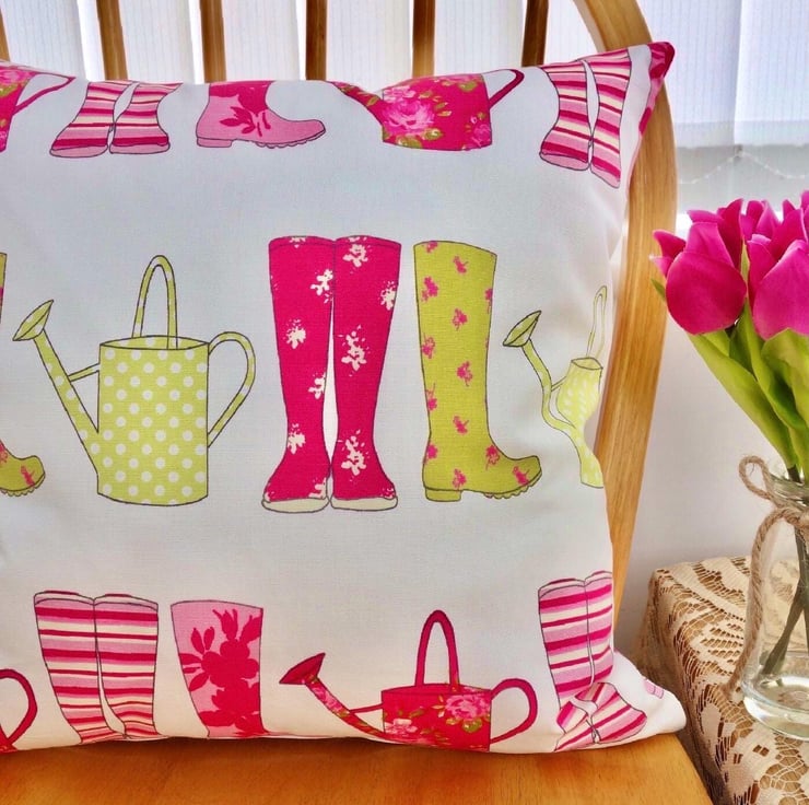 Cushion Cover - Pink & Green Wellington Boots & Watering Cans design on a Cream background, double sided.