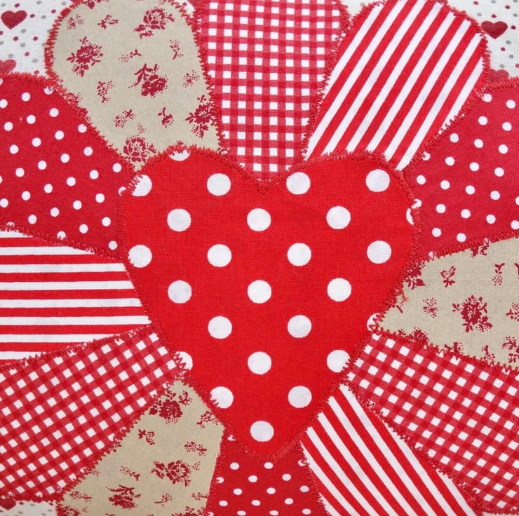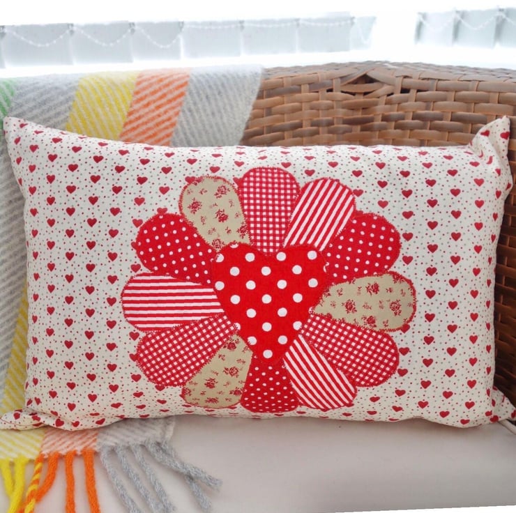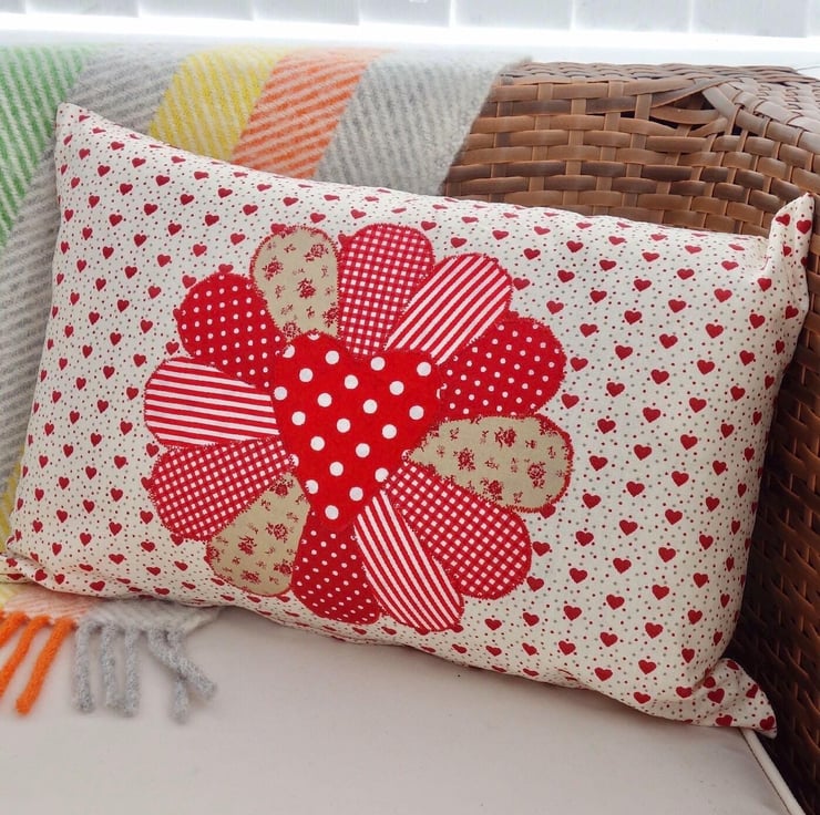 Handmade Appliqué Cushion with a Red Dresden design in multi patterned Red fabrics, on a Red heart and Cream fabric background.