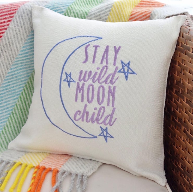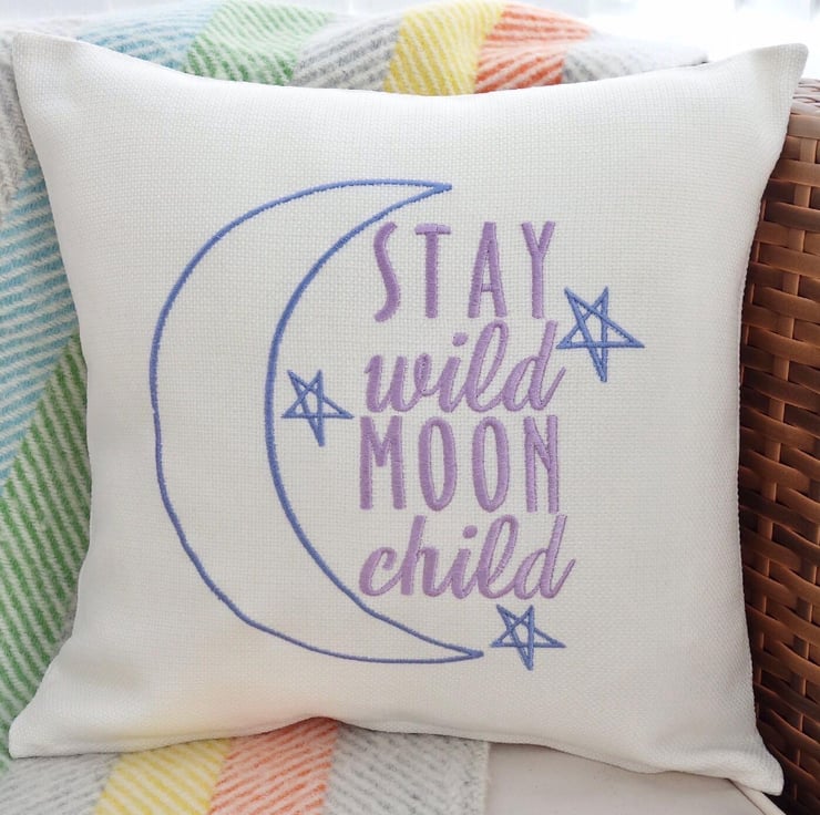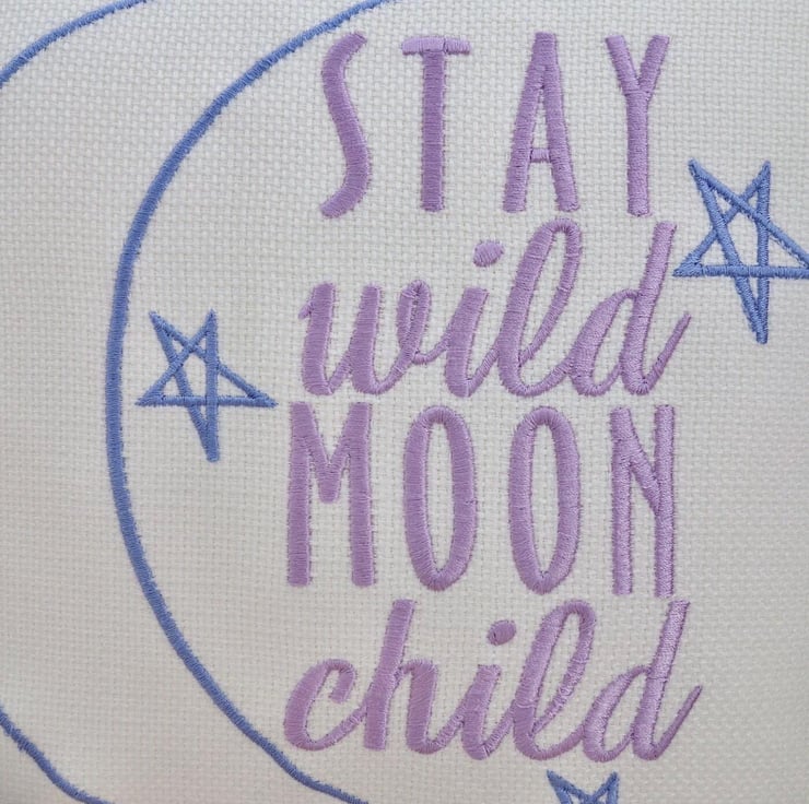 Handmade in a Light Cream fabric, machine embroidered with a Moon and Stars and the words: Stay Wild Moon Child, in Blue and Purple thread.