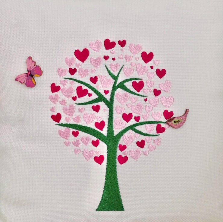 Handmade in a Light Cream fabric, machine embroidered with a Tree made up of shades of Pink hearts, and a Green trunk and branches. Decorated with a wooden button Butterfly and Bird.