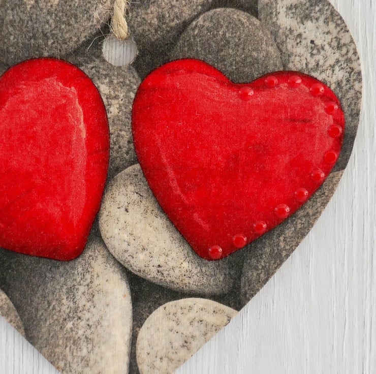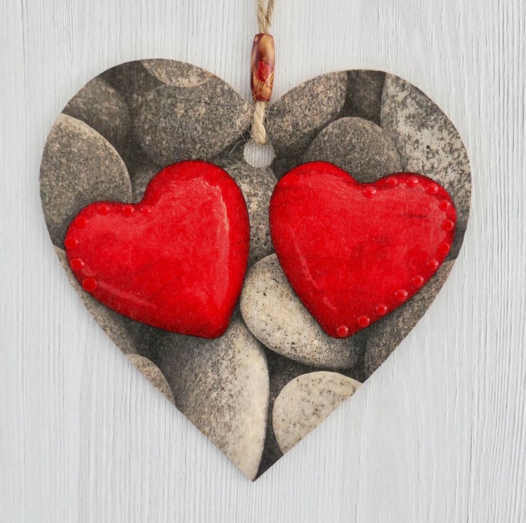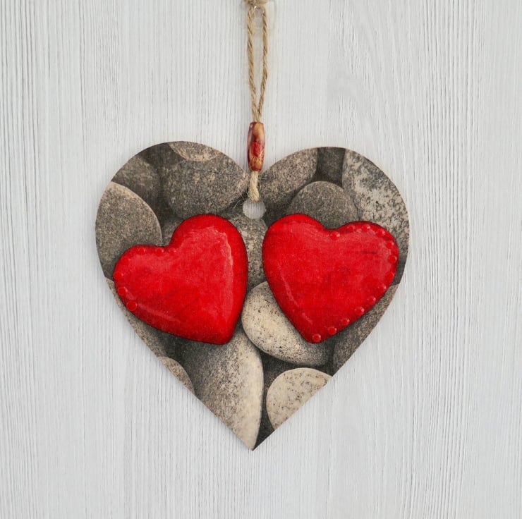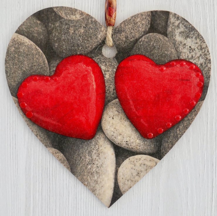 Decoupaged Wooden Hanging Heart: Shaped Pebbles design 15cm