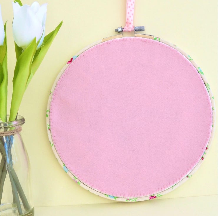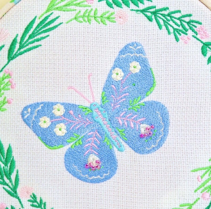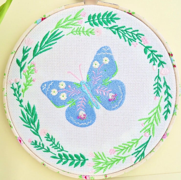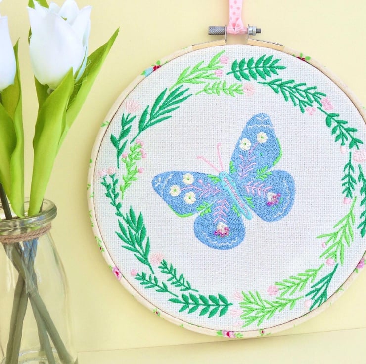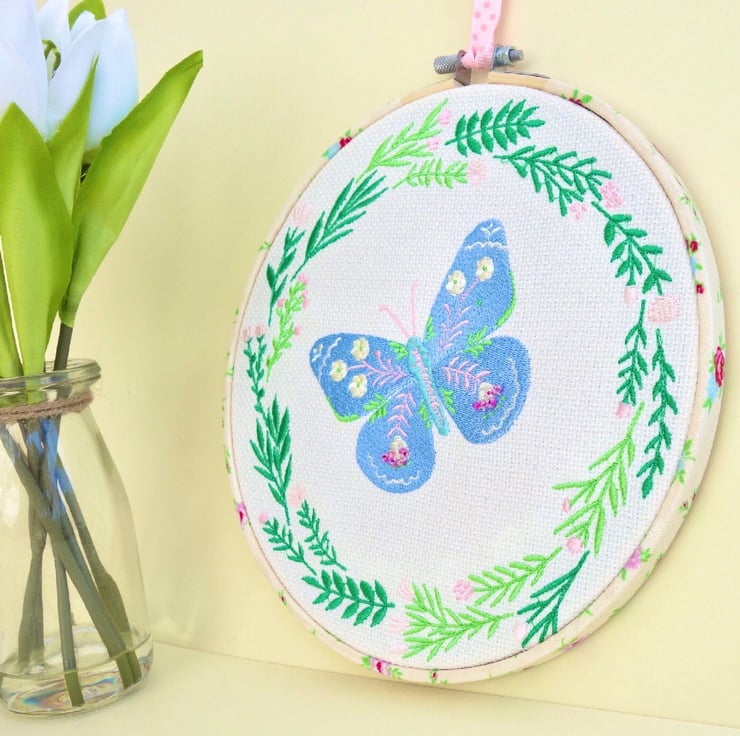 A machine Embroidered Hoop Wall Hanging, with a Blue patterned Butterfly inside a Green foliage wreath with Pink flowers, on a Cream fabric background.
