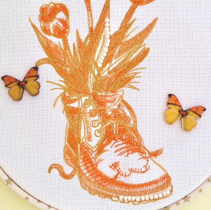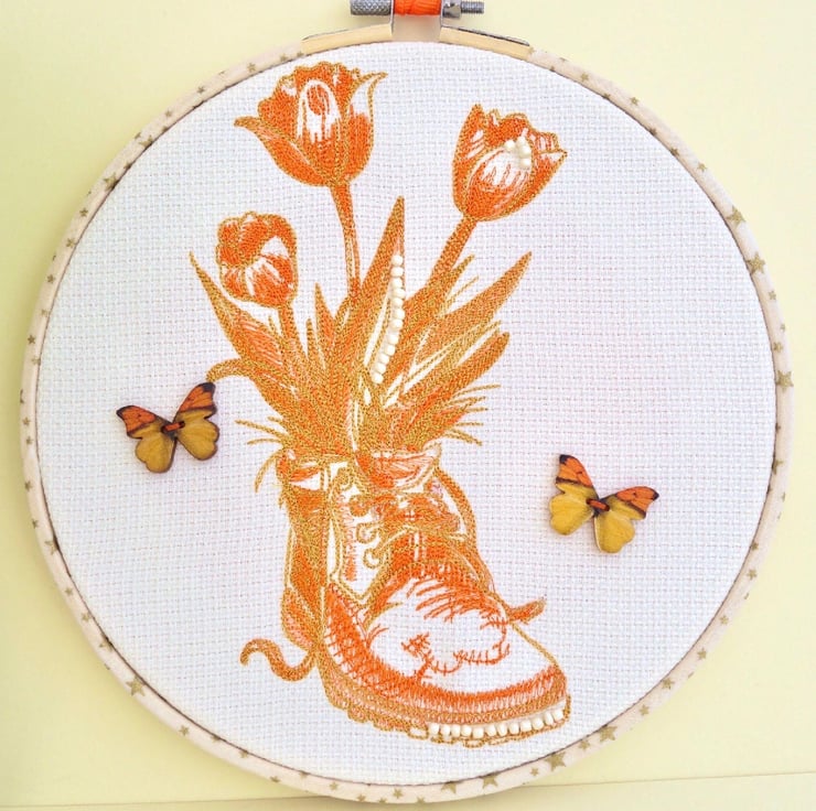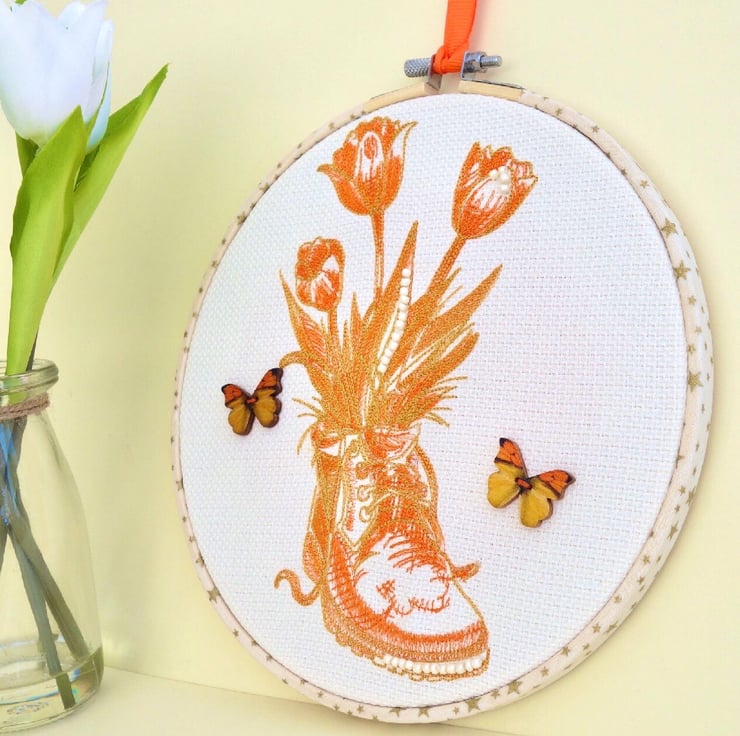 A machine Embroidered Hoop Wall Hanging, with an Old Boot in shades of Orange and Tan, filled with flowers in same colours. Decorated with beads and wooden button butterflies, on a Light Cream fabric background.