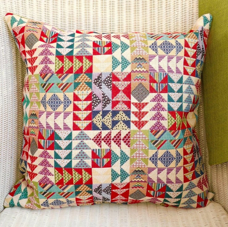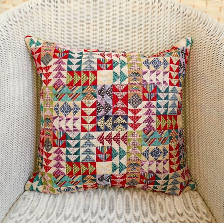 A handmade multi coloured Cushion Cover, with stitched and overlocked seams, and zip fastening at the bottom.