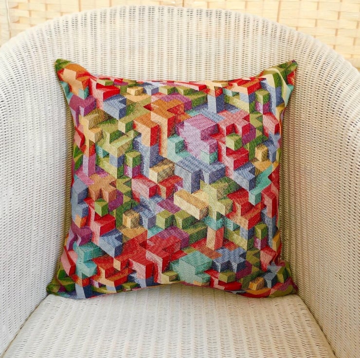 A handmade multi coloured Cushion Cover, with stitched and overlocked seams, and zip fastening at the bottom.